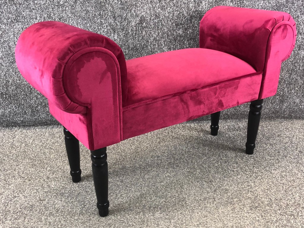 A red French velvet double-ended daybed-style footstool. The plush velvet upholstery radiates sophistication, offering both comfort and statement appeal. Its rich hue catches the light beautifully, creating a striking focal point that complements both modern and traditional interiors.