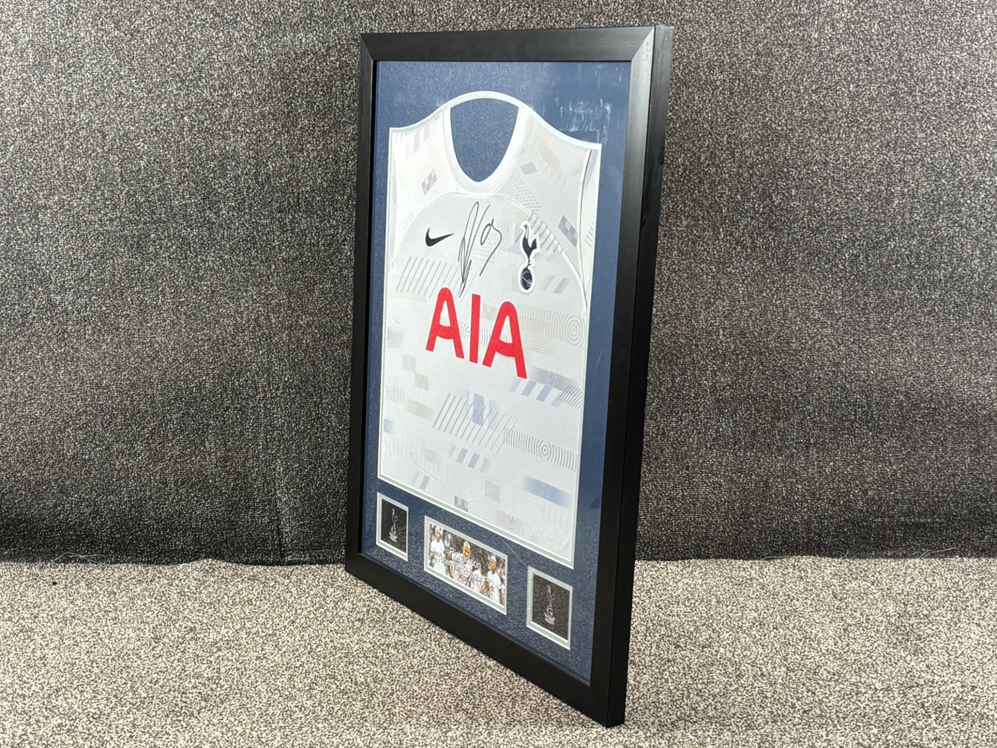 The shirt is stylishly mounted against a deep blue backdrop with silver trim, enhancing its bold design and colours. The frame also includes official Tottenham Hotspur crests and an image of Richarlison in action, adding depth and authenticity to the presentation. Professionally finished, this display is ready to be the centrepiece of any memorabilia collection.