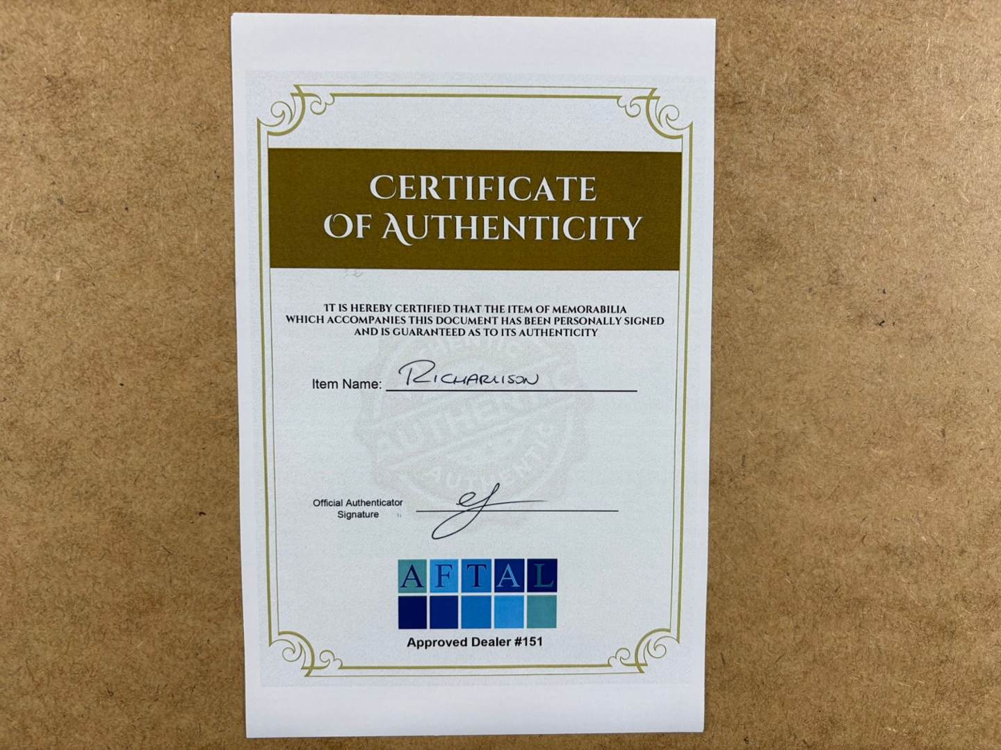 A signed and authenticated Richarlison Tottenham Hotspur football shirt, presented in a striking display frame measuring approximately 83cm in height and 68cm in width. This exclusive piece features the Brazilian forward’s autograph on the iconic white Spurs shirt, making it a must-have collectable for fans of both Tottenham and Richarlison himself.