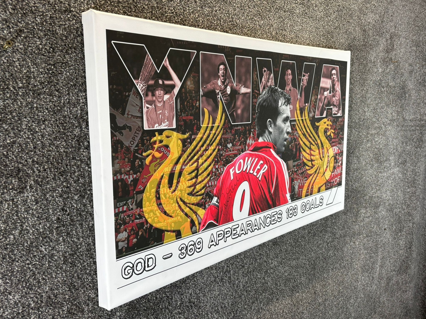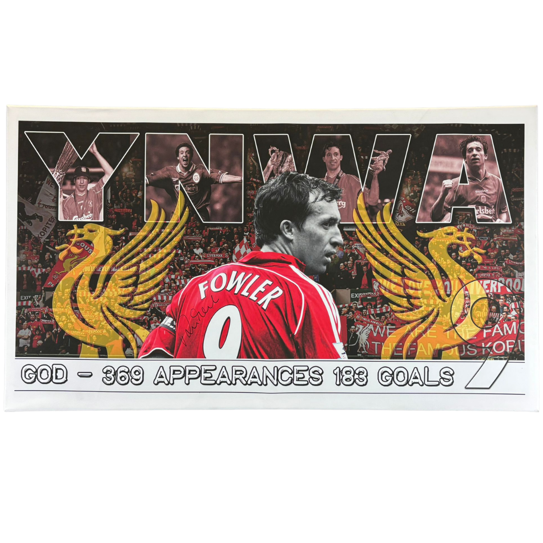 The canvas features a bold and dynamic montage design, with Fowler central in his iconic number 9 shirt, surrounded by memorable moments from his Liverpool career. Striking visual elements, including the Liver bird motifs and crowd backdrops, enhance the overall impact, while his signature is clearly displayed across the artwork, adding authenticity and collector appeal. The inclusion of his career statistics further reinforces the significance of his contribution to the club.