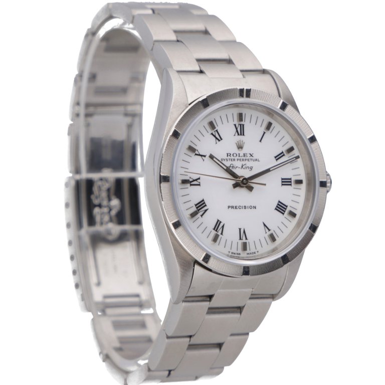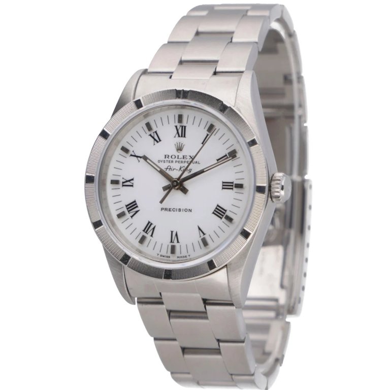 A Rolex Oyster Perpetual Air-King Watch, model 14010, presented in immaculate condition. This 1996 stainless steel reference features a 34mm Oyster case, a distinctive engine-turned bezel, and a crisp white dial with black Roman numeral hour markers.