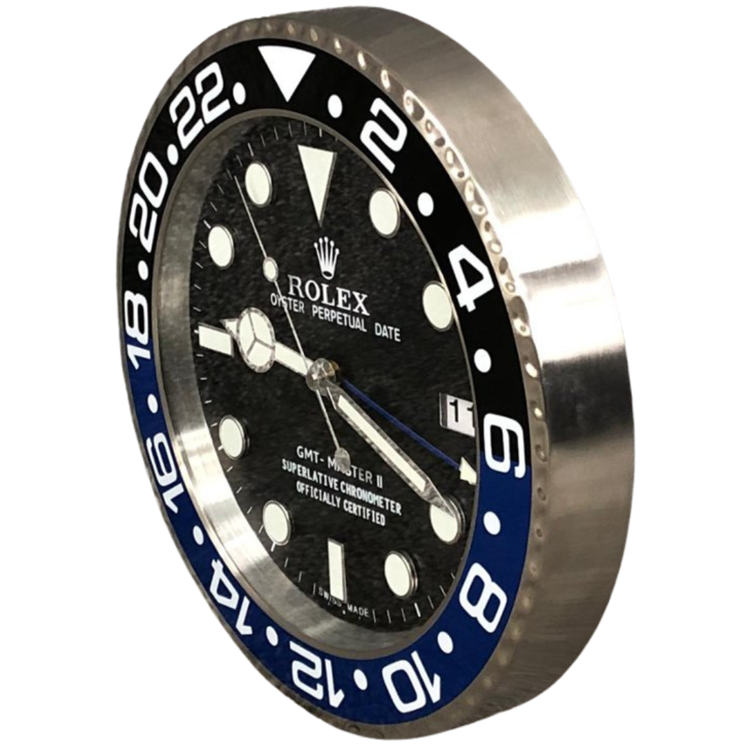 A stainless steel replica Rolex black and blue GMT Master II wall clock is a testament to both luxury and functionality, meticulously crafted to emulate the renowned Rolex GMT Master II timepiece. Encased in polished stainless steel, this wall clock exudes durability and sophistication, capturing the essence of Rolex's legendary craftsmanship. Standing approximately 14 inches tall and wide, it commands attention as a striking focal point in any room or space.