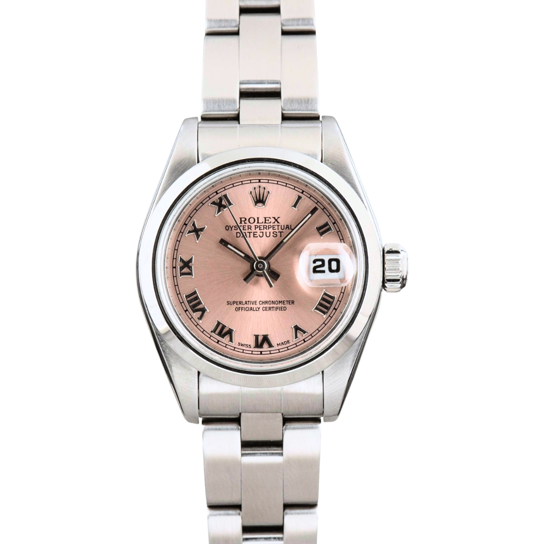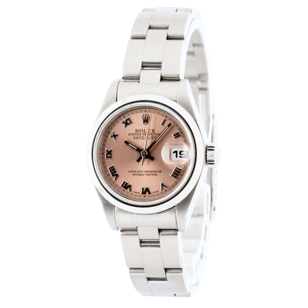 A 1995 Rolex Date, reference 69160, is a timeless classic crafted entirely from robust stainless steel. Featuring a refined 26mm case, the watch houses a crisp white dial adorned with striking Roman numeral hour markers, giving it a distinctly sophisticated and traditional aesthetic.