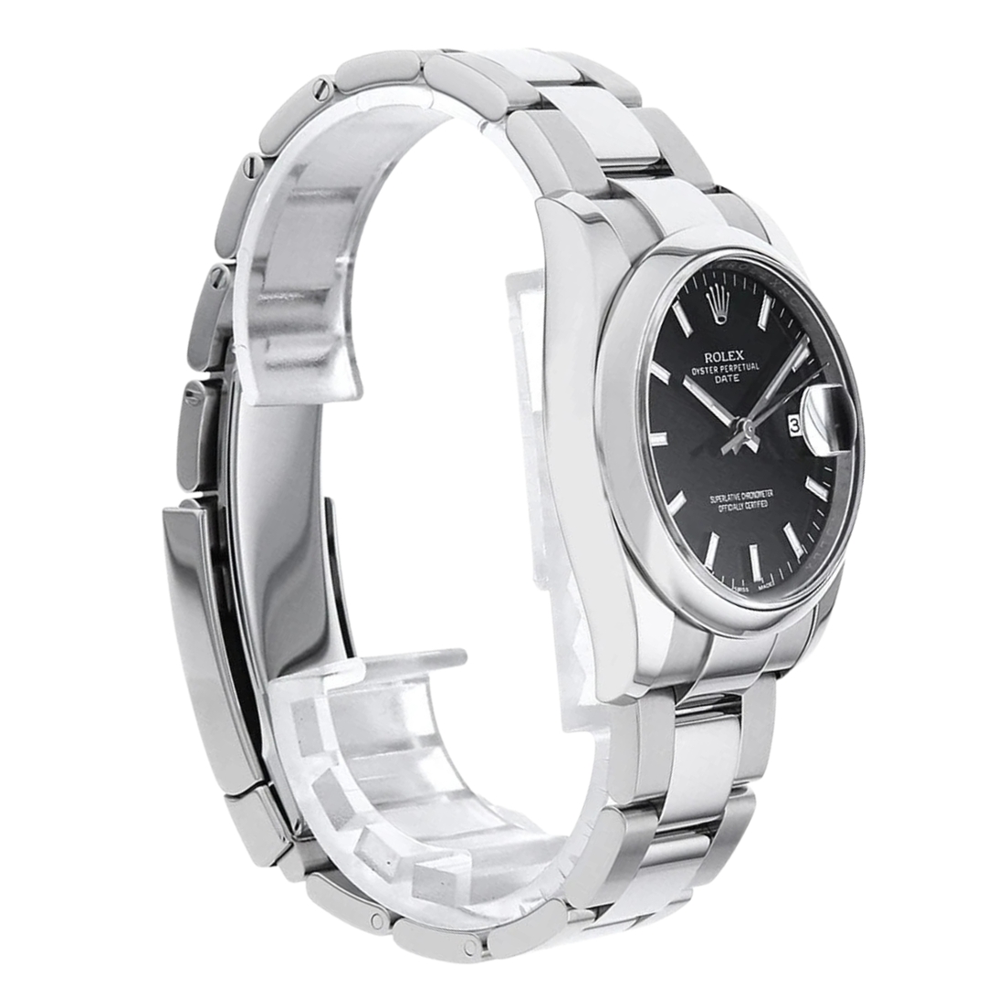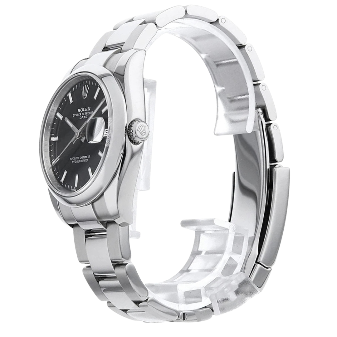 A Rolex Date 115200 is a sophisticated, reliable timepiece that combines elegance and functionality. This 2013 model, crafted from stainless steel, features a crisp black dial with silver-tone hour markers for optimal legibility. The 34mm case size offers a slightly smaller yet refined presence, making it an excellent choice for those who prefer a more compact, classic watch.
