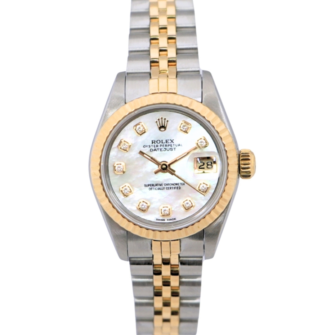 A Rolex Datejust, reference 69173, combining timeless elegance with luxurious modern detailing. Crafted from stainless steel and 18ct yellow gold, this 26mm model features an exquisite 18ct gold fluted bezel framing a mesmerising afterset mother-of-pearl dial. The dial is enhanced with diamond-set hour markers, radiating sophistication and subtle glamour, while the classic Jubilee bracelet completes the watch with a perfect balance of comfort and refinement.