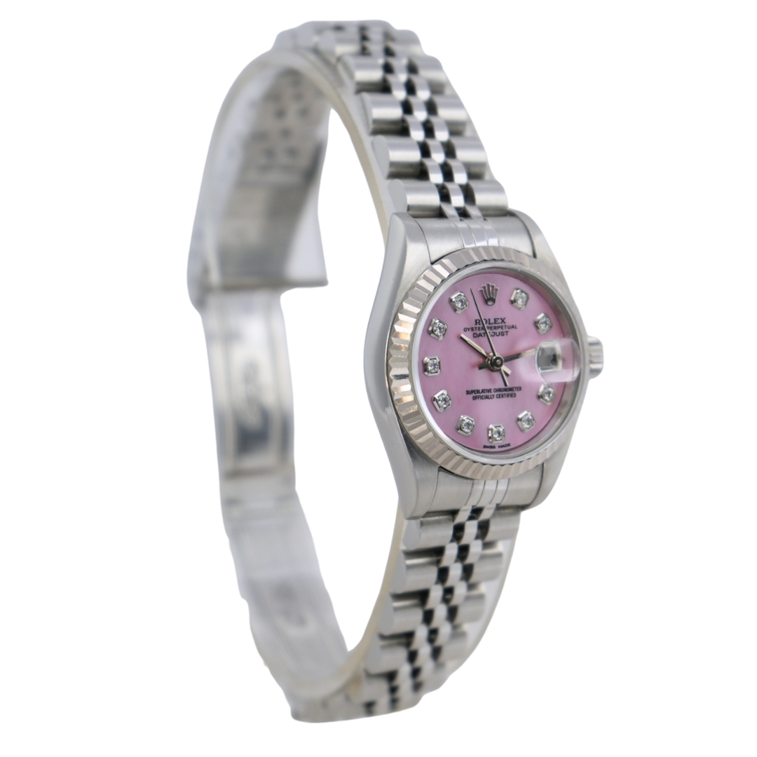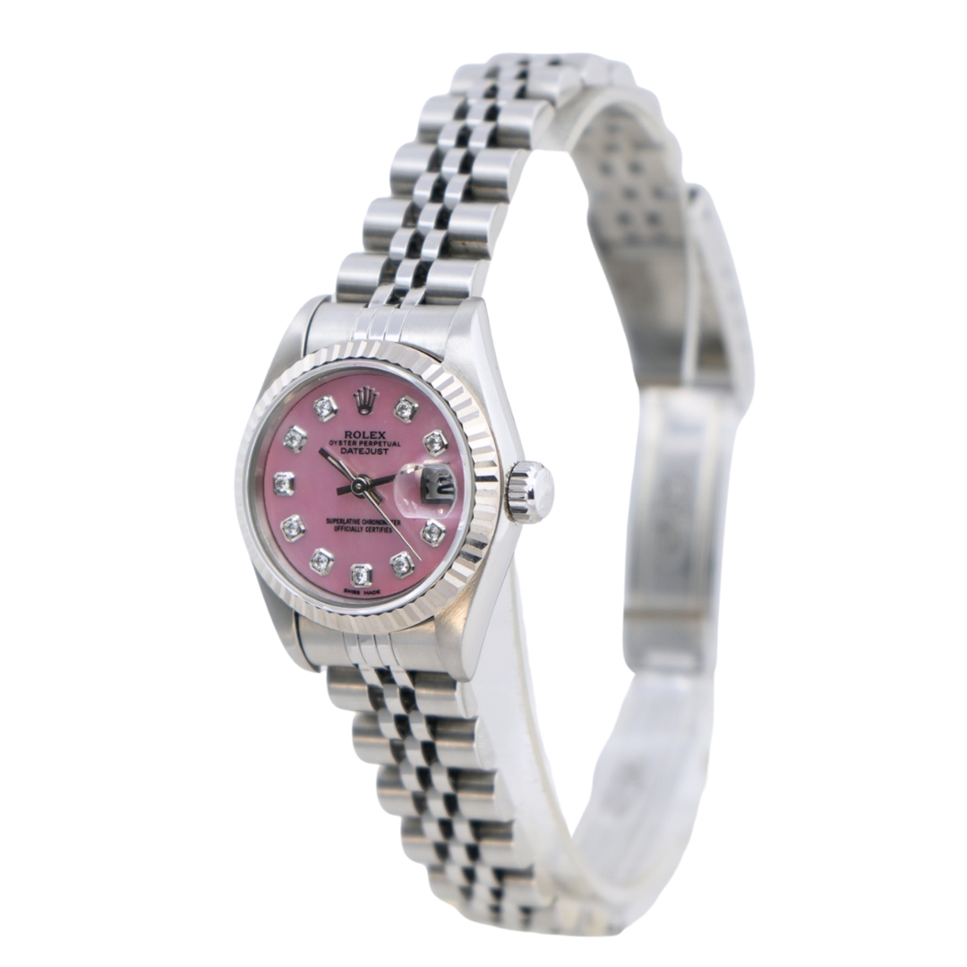 A Rolex Datejust 26 Watch that brings together classic Rolex heritage and contemporary individuality, this reference 69174 is presented beautifully in stainless steel with an 18ct white gold fluted bezel. The afterset pink mother-of-pearl dial with diamond numerals gives the piece a distinctive presence, elevating it into the realm of standout collector variants within the traditional Lady-Datejust line.