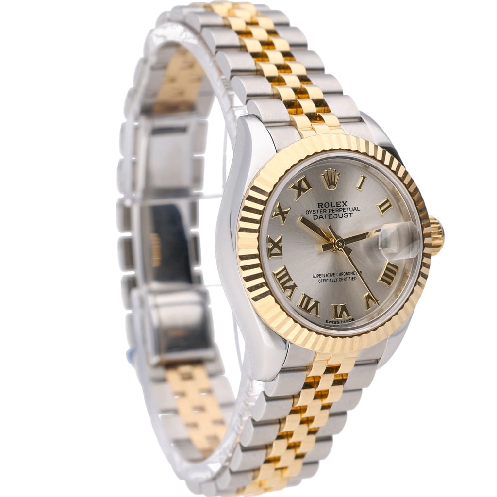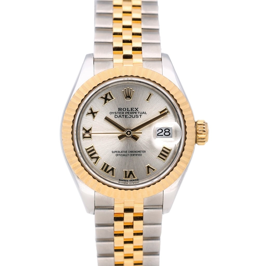 This immaculate Rolex Datejust 28, reference 279173, showcases the timeless appeal of stainless steel and 18ct yellow gold in one of Rolex’s most elegant proportions. The watch features a refined silver dial enriched with classic Roman numerals, offering a beautifully traditional aesthetic that pairs perfectly with the fluted yellow gold bezel. At 28mm, the case sits with a delicate yet confident presence on the wrist, encapsulating the sophistication that has made the Lady-Datejust an enduring favourite for generations.