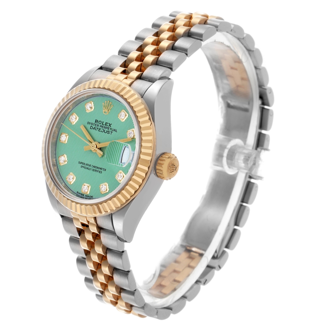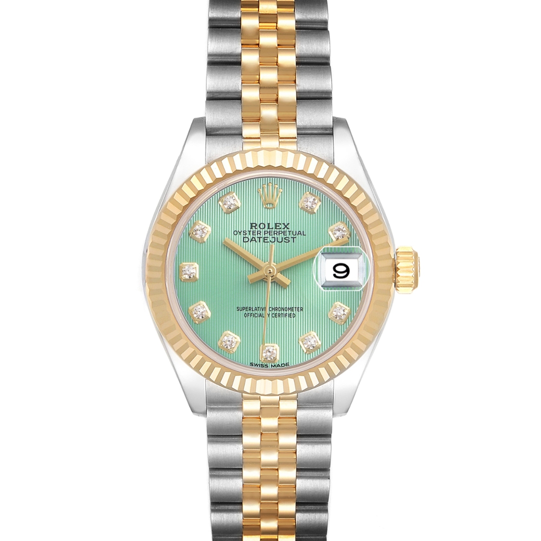 A Bi-Metal Rolex Datejust 28 Watch, Stainless Steel & 18ct Yellow Gold with a Yellow Gold Fluted Bezel on a an Original Rolex Green Striped Dial with Original Rolex Diamond Numerals