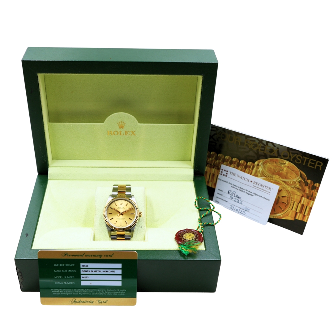 Dating from 1992, this example is presented in immaculate condition and comes complete with its original Rolex box, authenticity paperwork, and certification. Supported by a 12-month WLC warranty, it offers peace of mind and lasting value. The Rolex Datejust 14233 with its champagne baton dial and fluted gold bezel is a true classic.