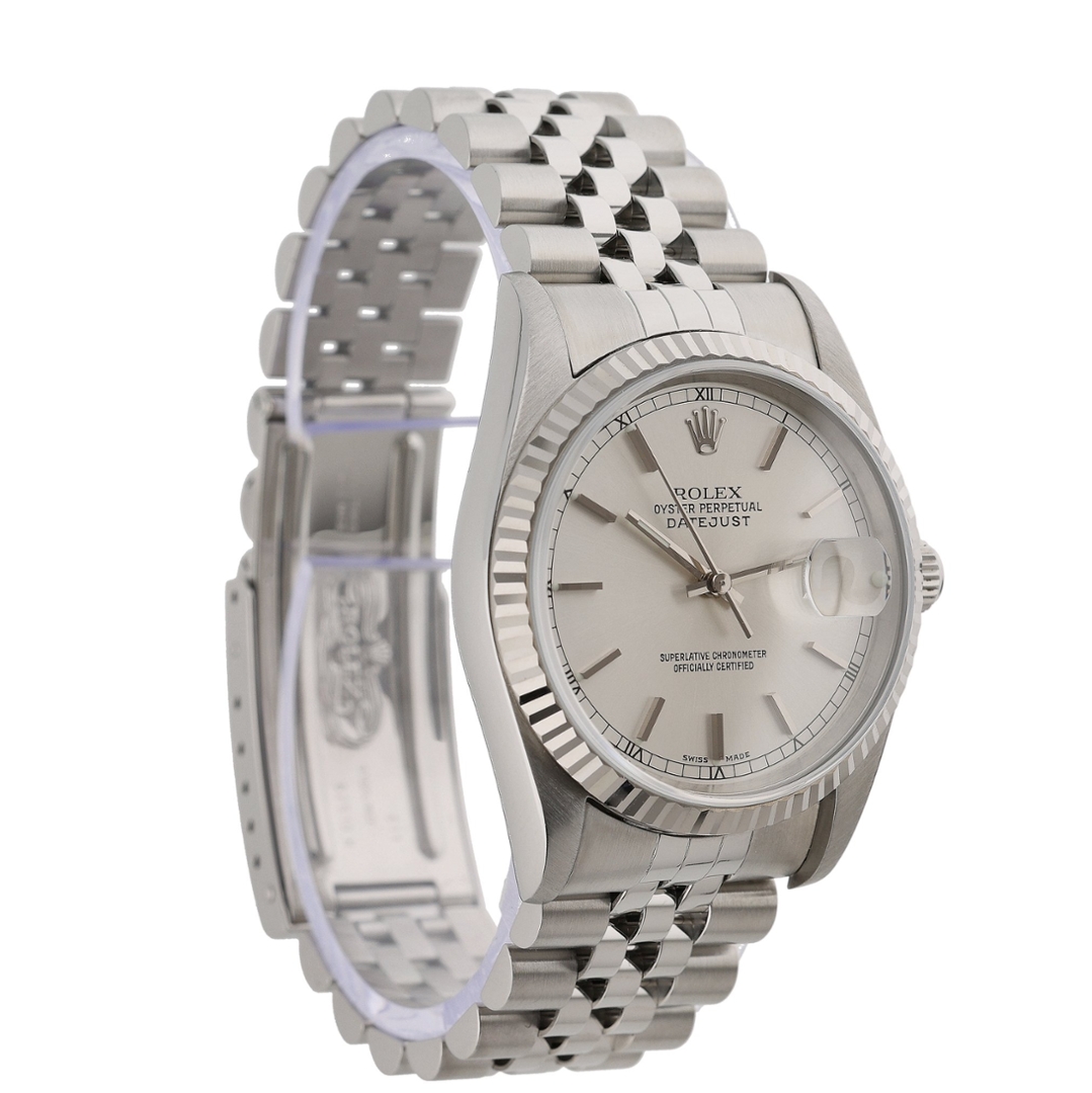 A Rolex Datejust Watch, Stainless Steel with an 18ct White Gold Bezel on a Silver Dial