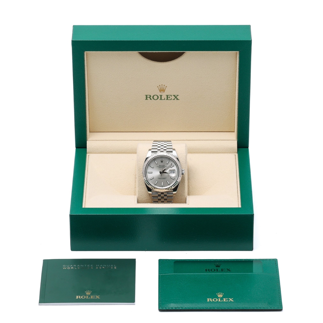 Dated 2023 and presented in immaculate condition, this example is accompanied by its original Rolex box, full set of paperwork, and certification. Backed by the Rolex manufacturer's warranty until 2028, it offers complete peace of mind. The Datejust 41 in steel and white gold with a silver dial remains a true modern classic — an enduring symbol of Rolex’s mastery in both design and precision.