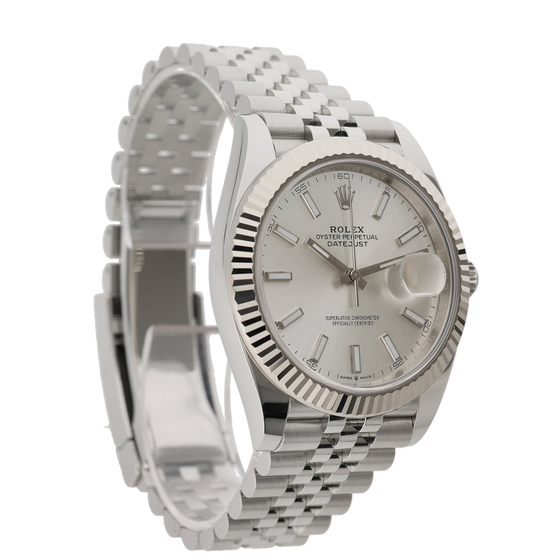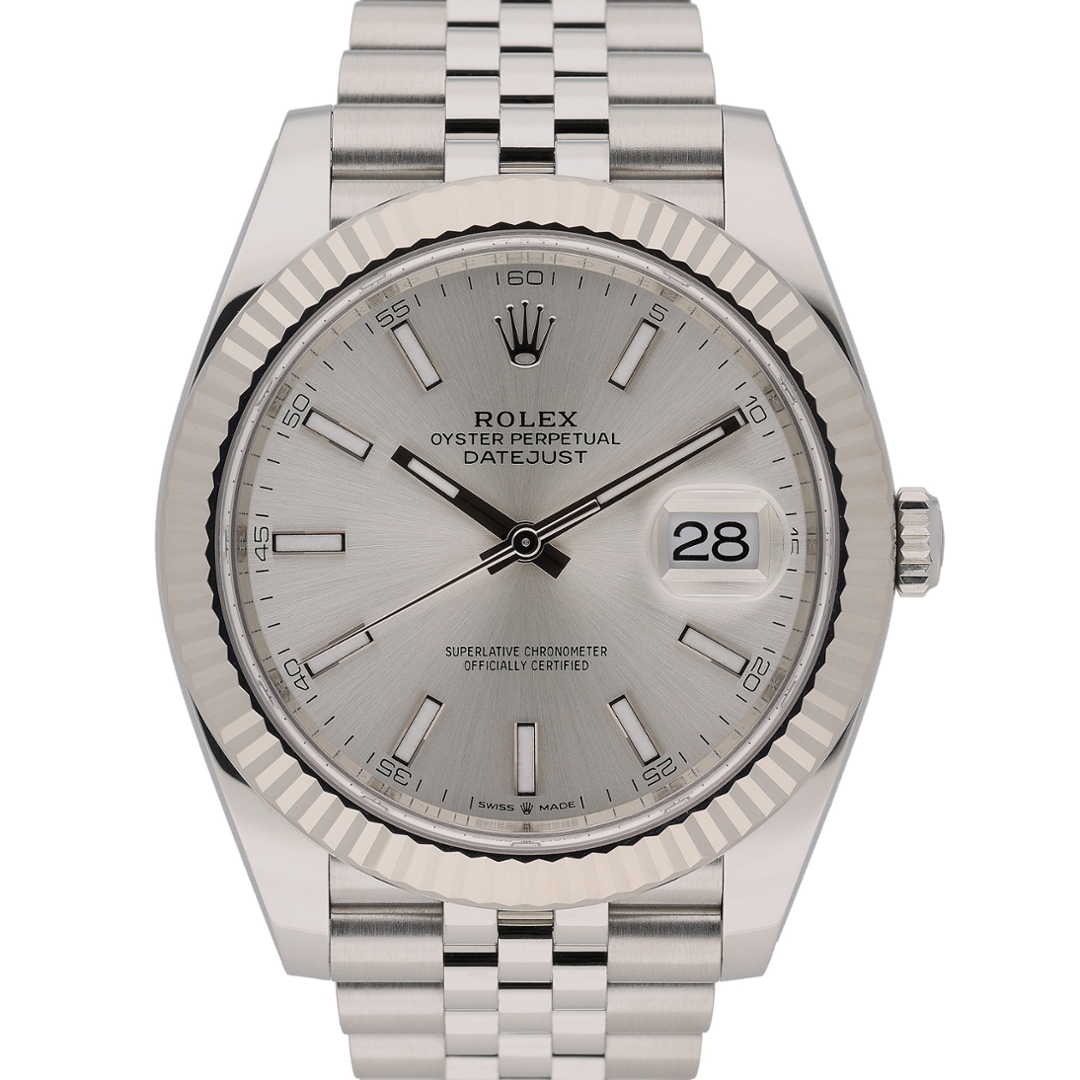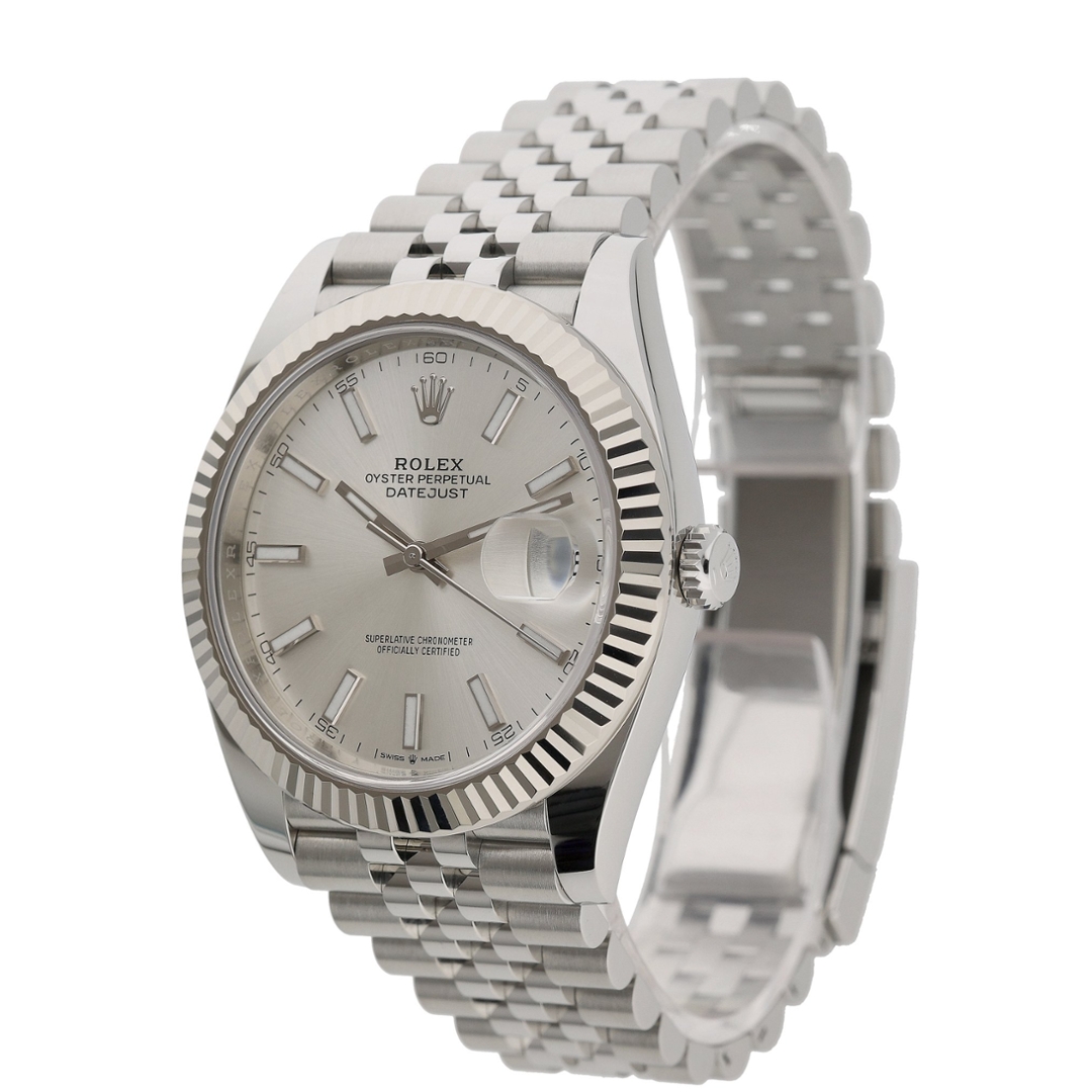A Rolex Datejust 41 Watch, Stainless Steel with an 18ct White Gold Fluted Bezel and a Silver Dial.