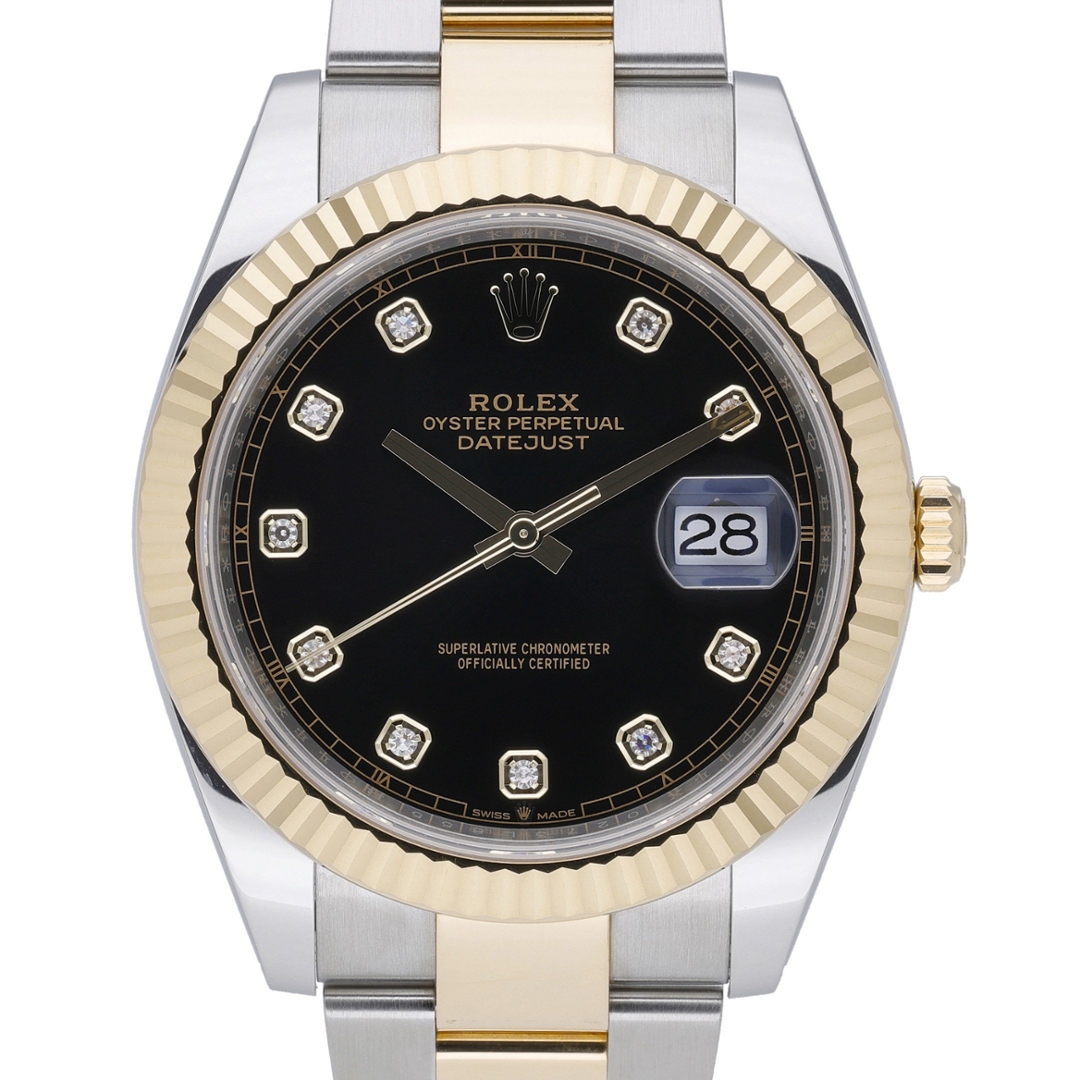 A Bi-Metal Rolex Datejust 41 Watch, Stainless Steel and 18ct Yellow Gold with a Yellow Gold Fluted Bezel on a Black Dial with Original Rolex Diamond Numerals