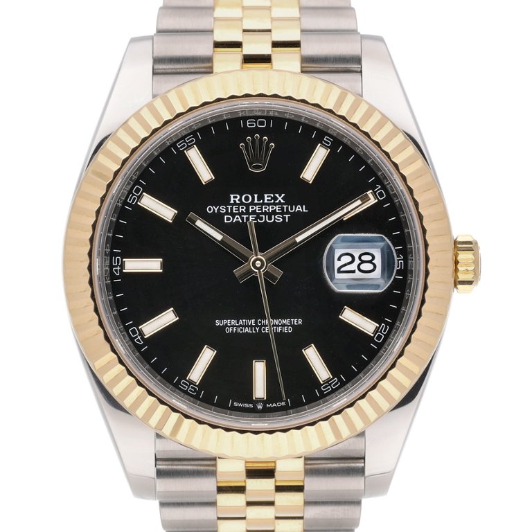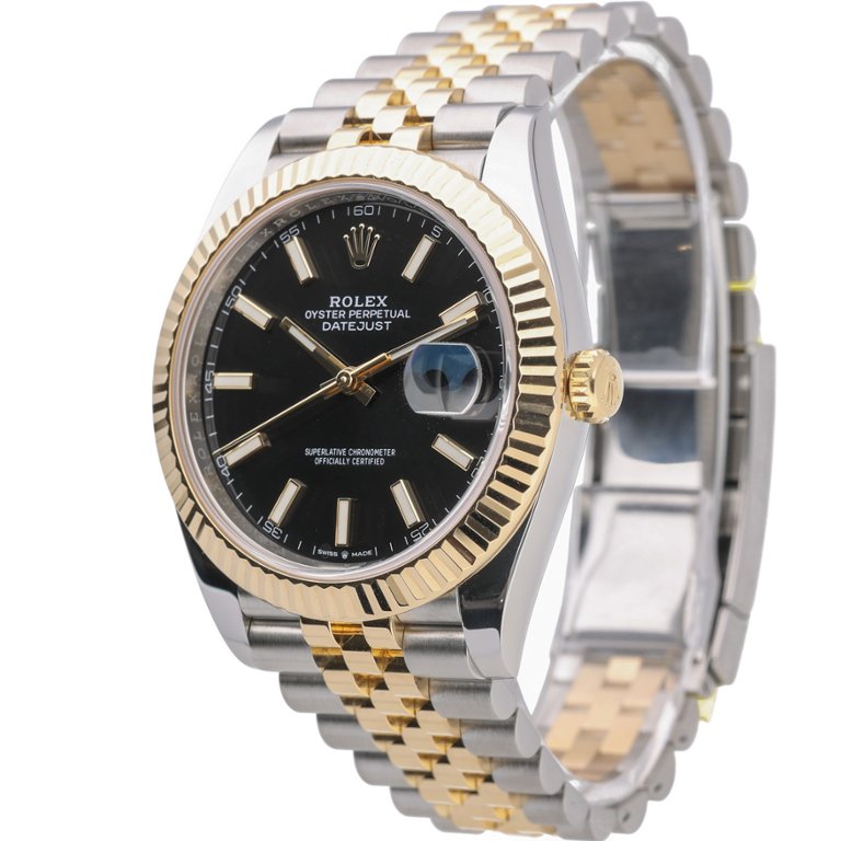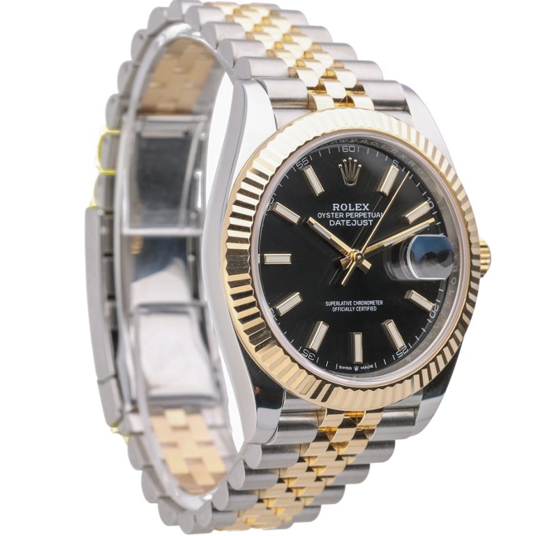 Bi-Metal Rolex Datejust 41 Watch, a harmonious blend of stainless steel and 18ct yellow gold, featuring a luxurious yellow gold fluted bezel and a captivating black dial. Crafted with precision and elegance, this timepiece, model 126333, is from 2023 and epitomises timeless sophistication and superior craftsmanship.