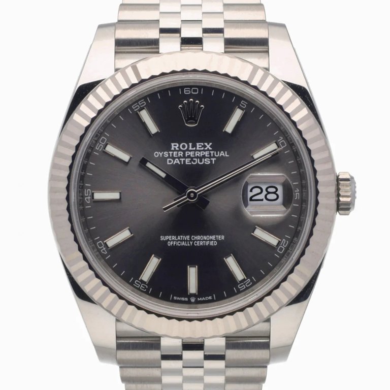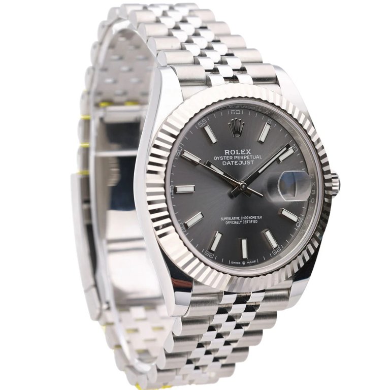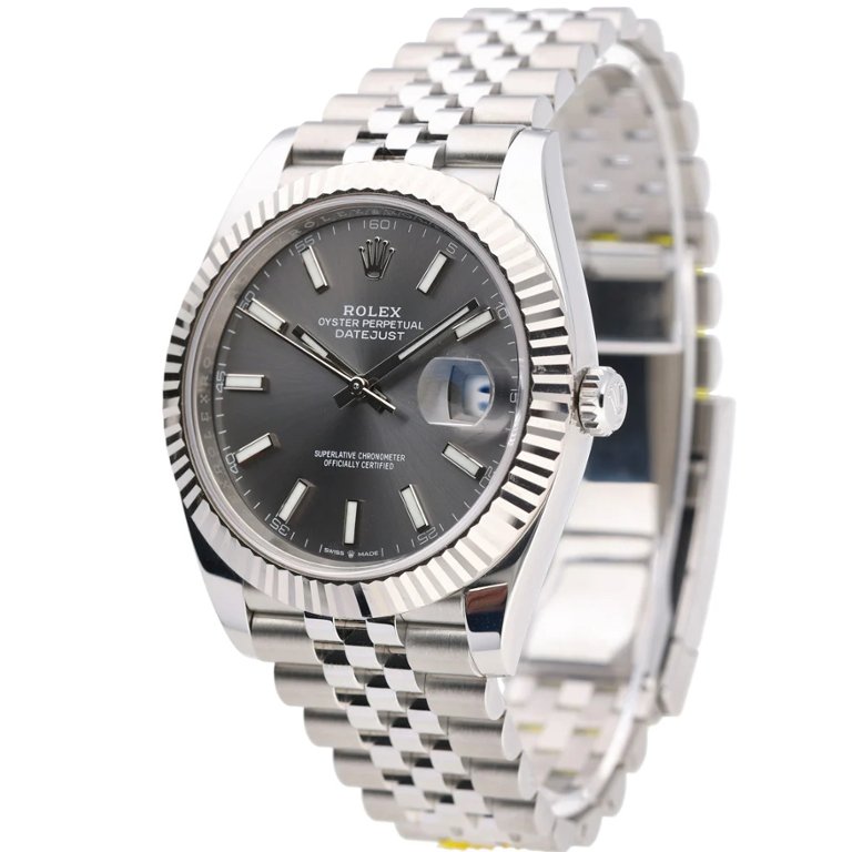 A Rolex Datejust 41 Watch, Stainless Steel with an 18ct White Gold Fluted Bezel and a Grey Dial.