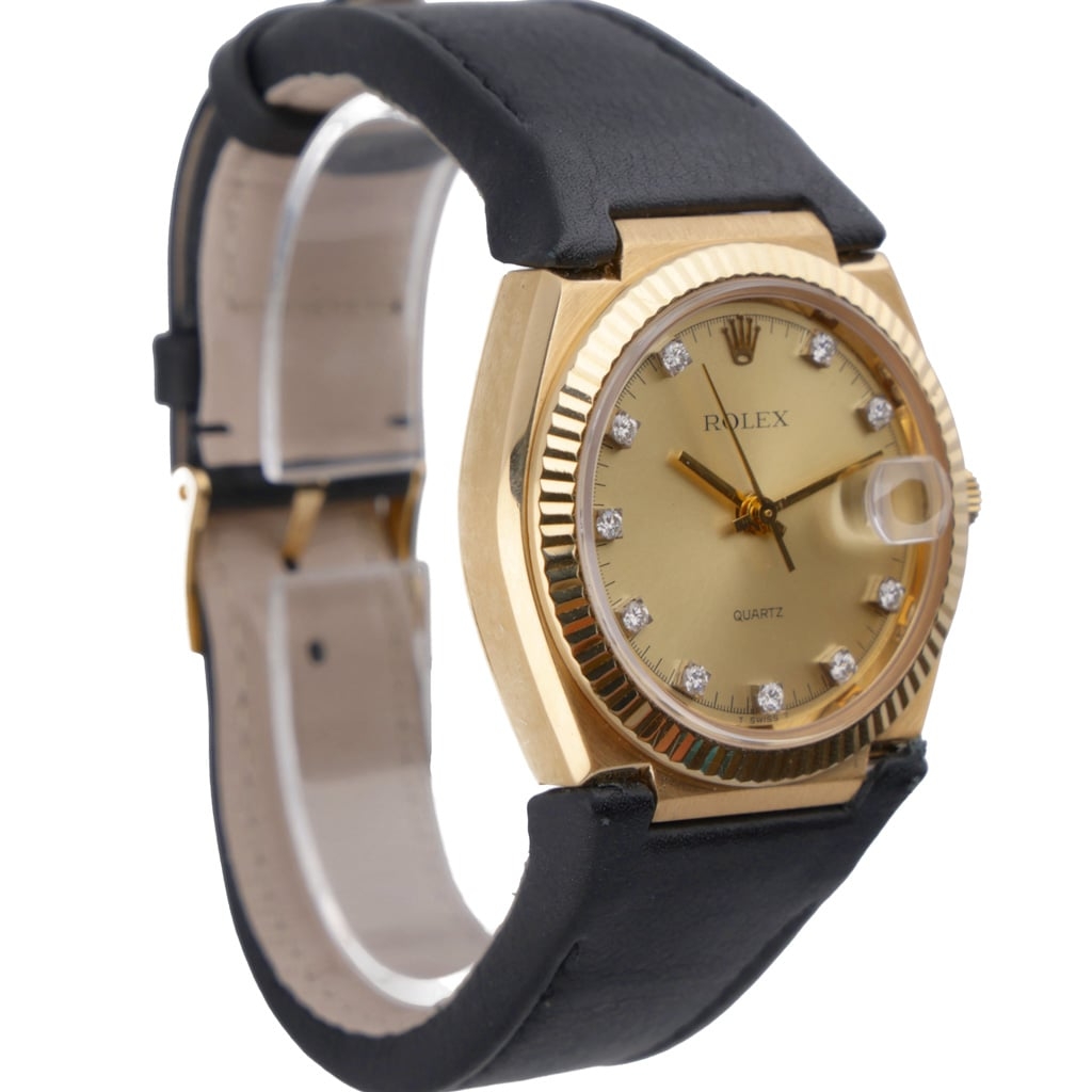 Encased in a bold 39mm case, this watch is a distinctive departure from Rolex’s traditional aesthetics, featuring sharp lines, a substantial profile, and an unmistakable vintage character. The champagne dial is elegantly enhanced with original Rolex-set diamond hour markers, exuding luxury while retaining the clean design language of the era. The watch is presented on a black leather strap with a solid 18ct yellow gold Rolex clasp. Still, it is also accompanied by its original matching gold bracelet — a valuable addition for collectors.