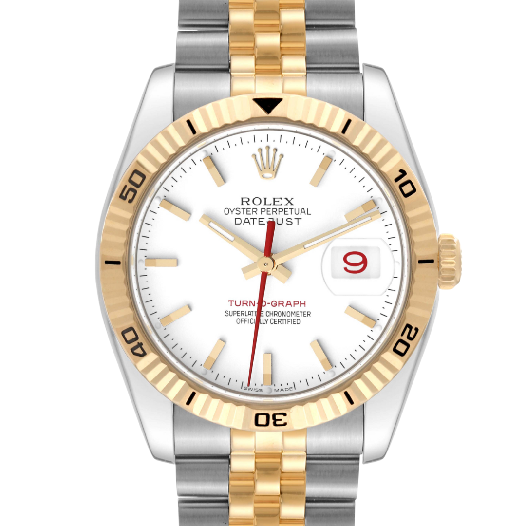 A bi-metal Rolex Datejust Turn-O-Graph watch, reference 116263, offered in immaculate condition. Crafted from stainless steel and 18ct yellow gold, this 36mm model features the distinctive yellow gold rotating fluted bezel, originally developed as a timing tool and a defining trait of the Turn-O-Graph line. The clean white dial is complemented by gold baton hour markers, red seconds hand, and matching red date numeral beneath the Cyclops lens.