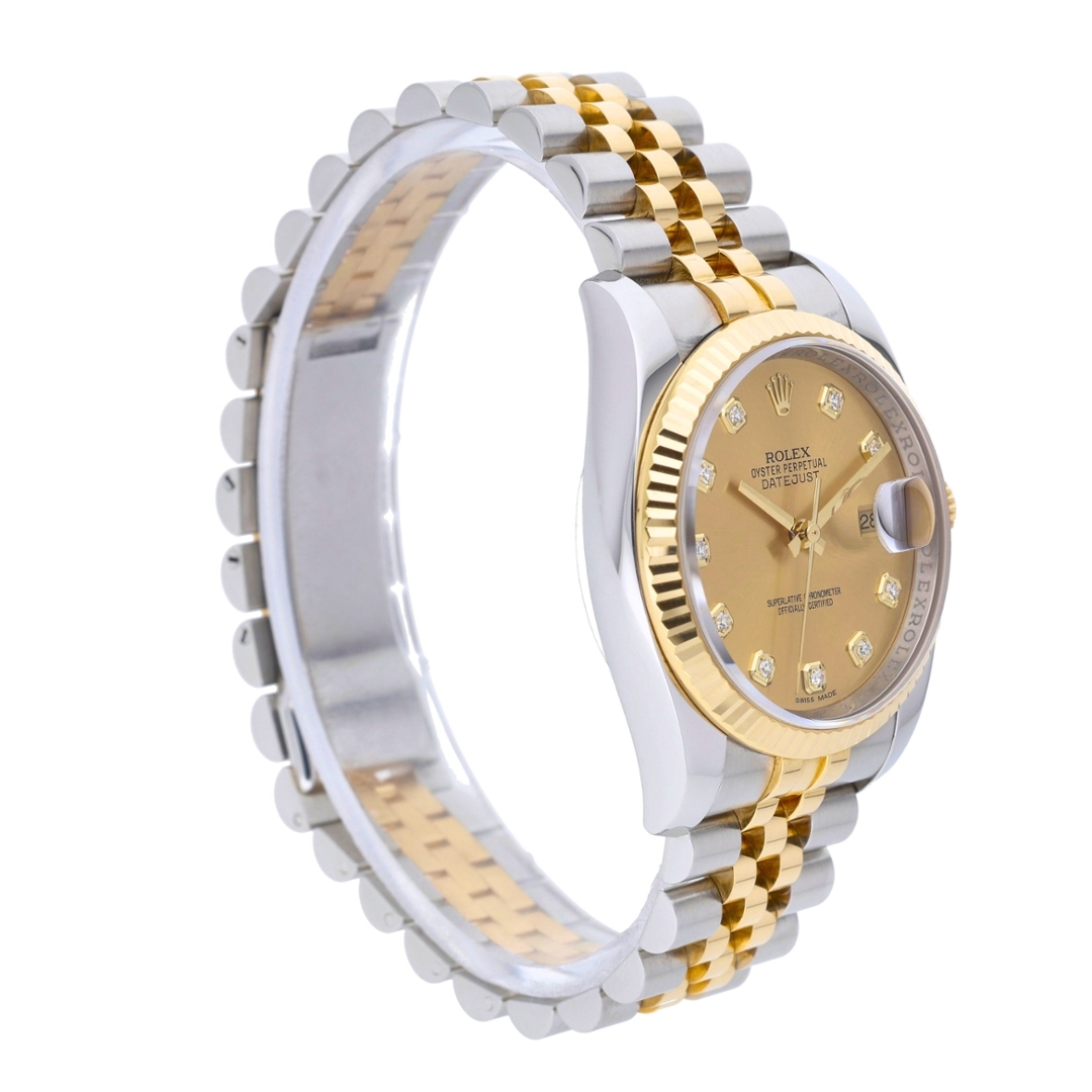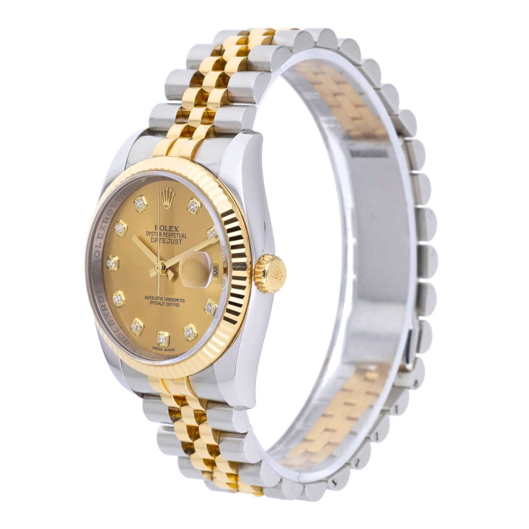 A Rolex Datejust Watch, model 116233, presented in immaculate condition. Crafted from stainless steel and 18ct yellow gold, this 2011 example features the iconic yellow gold fluted bezel and a champagne dial set with original Rolex diamond hour numerals. The 36mm Oyster case offers the classic Datejust proportions, paired with a bi-metal Jubilee bracelet and powered by the Rolex Calibre 3135 automatic movement.
