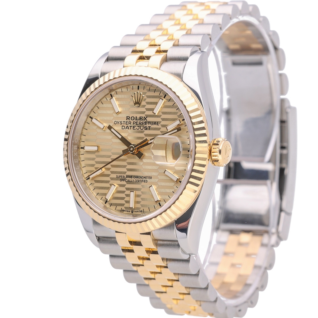 The hallmark of this exquisite watch is its yellow gold fluted bezel and matching gold fluted dial, which exudes opulence and refinement at every glance. Encased within the 36mm stainless steel and yellow gold case, the automatic movement ensures precision and reliability, embodying Rolex's legendary craftsmanship and expertise.