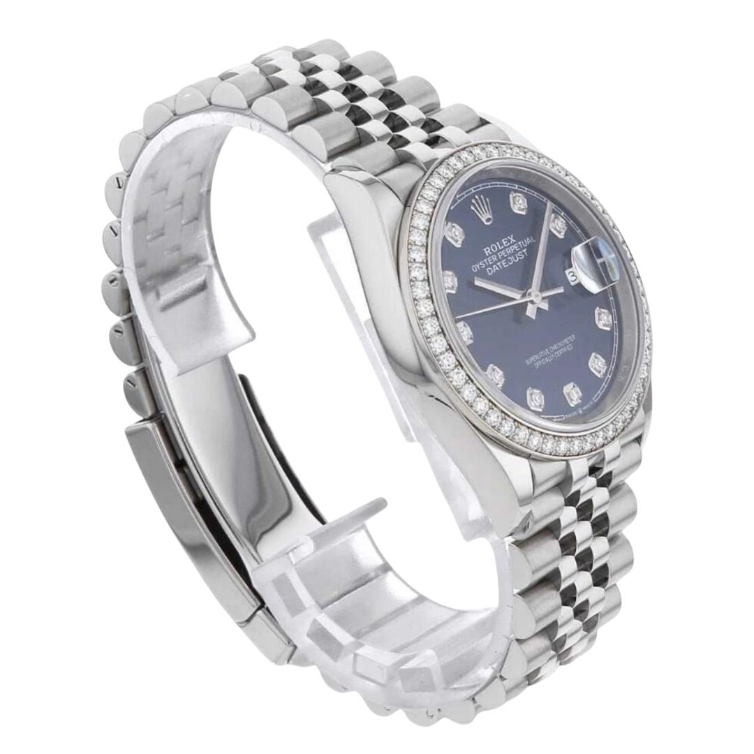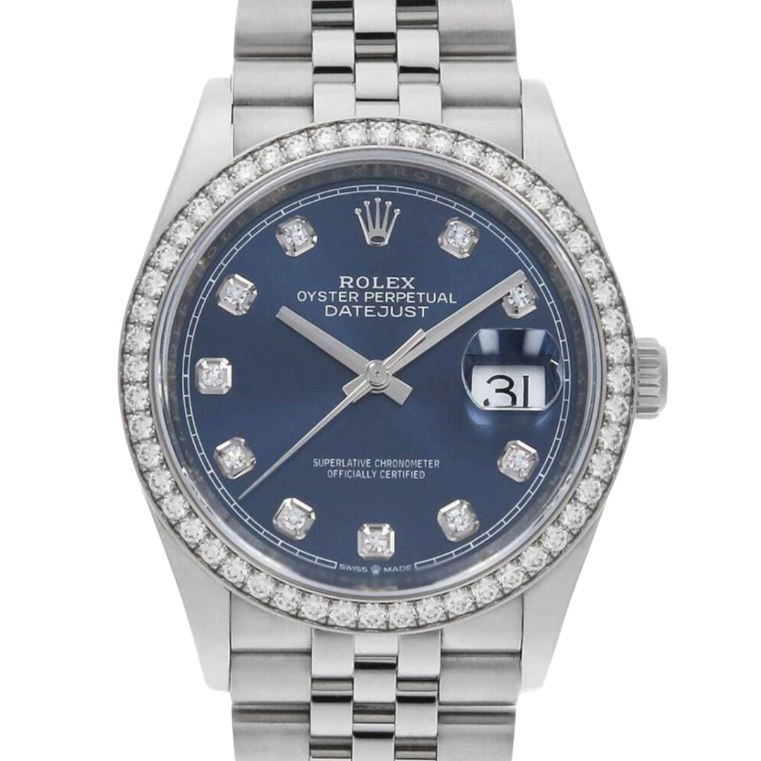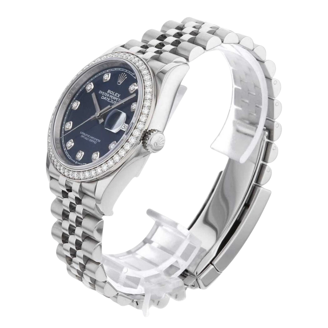 A Rolex Datejust reference 126284RBR, crafted in stainless steel and paired with an 18ct white gold diamond-set bezel. The 36mm Oyster case is complemented by a rich blue dial, fitted with original Rolex diamond hour markers and the signature date display at 3 o’clock beneath the Cyclops lens, creating a refined yet striking configuration.