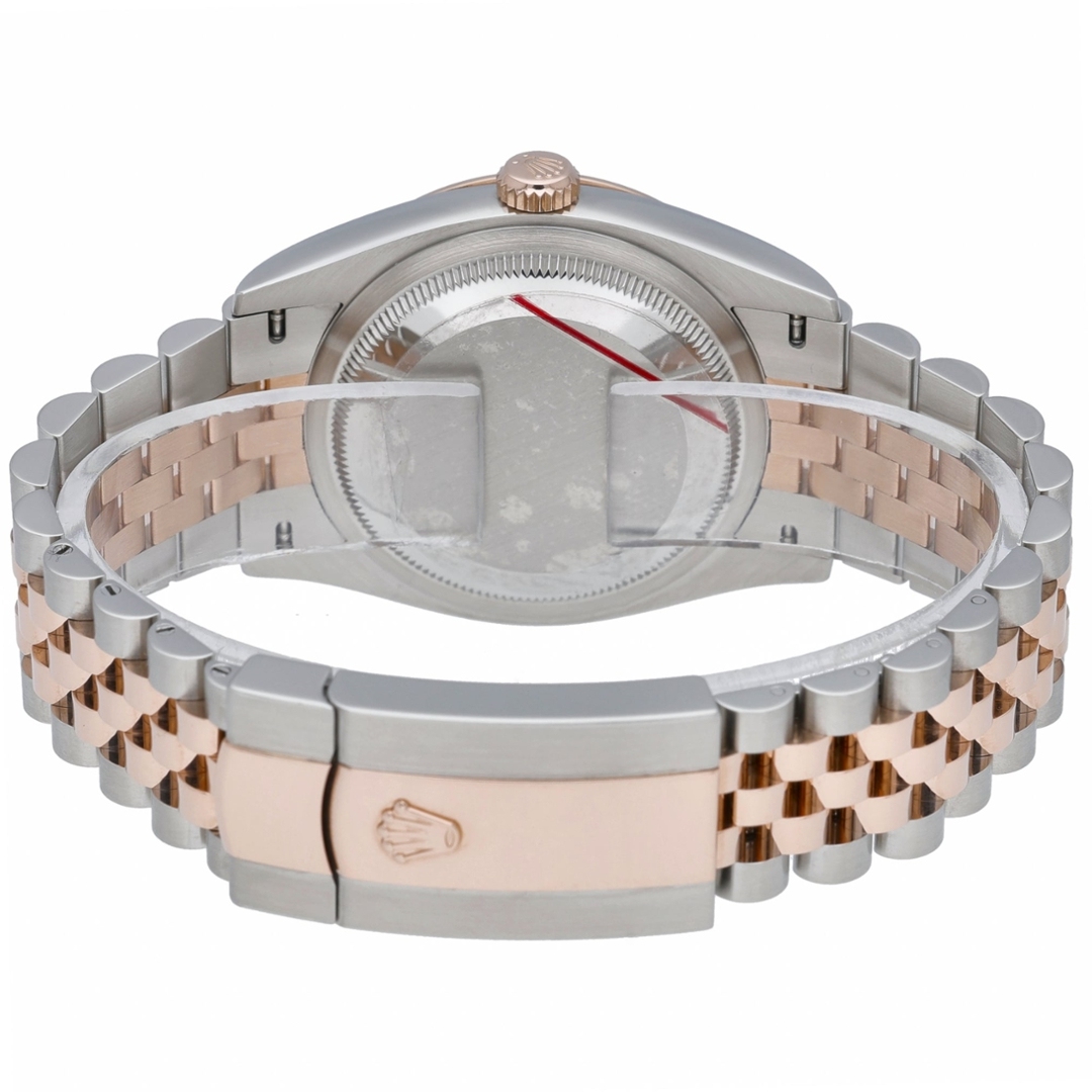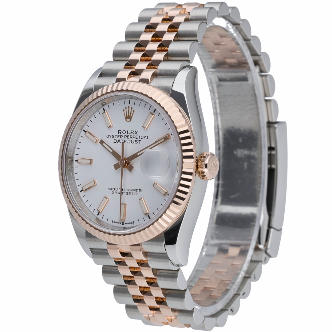 A bi-metal Rolex Datejust watch, model 126231, crafted in stainless steel and 18ct Everose gold with an 18ct Everose gold fluted bezel and a crisp white dial set with rose gold baton hour markers. The 36mm Oyster case is paired with the elegant Jubilee bracelet in steel and Everose gold, delivering a balanced blend of sport and refinement. The clean white dial enhances legibility while complementing the warmth of the rose gold accents, creating a timeless and highly versatile configuration.