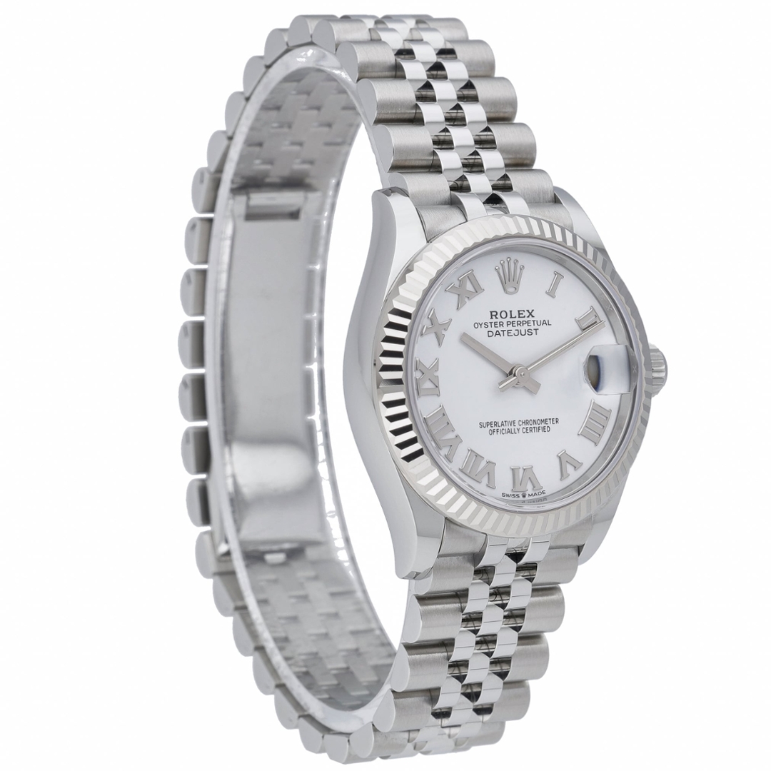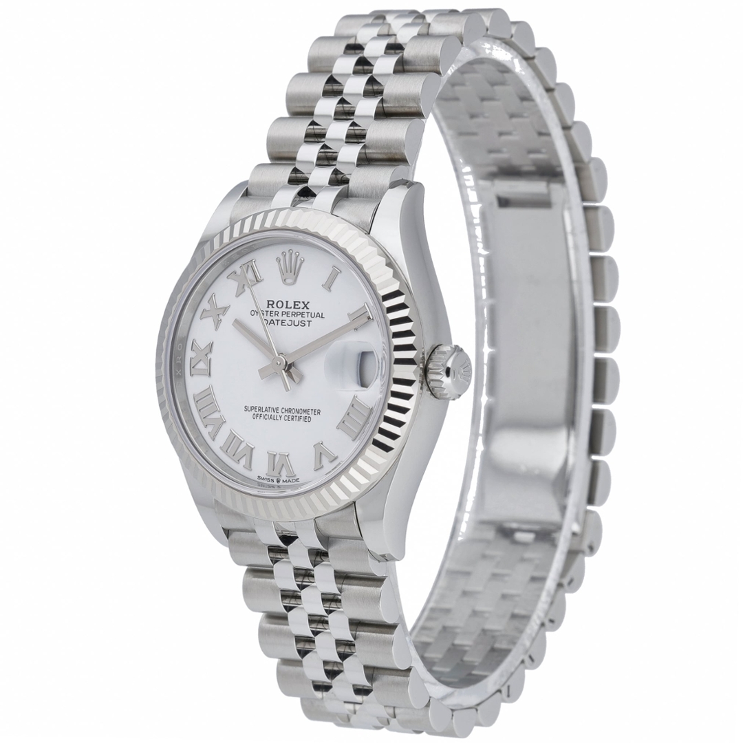 A Rolex Datejust watch, model 278274, crafted in stainless steel with an 18ct white gold fluted bezel and presented on the elegant Jubilee bracelet. The 31mm Oyster case offers refined proportions, while the fluted bezel adds signature Rolex definition and presence. The dial features a crisp white backdrop with bold black Roman numerals and a date display at 3 o’clock beneath the Cyclops lens, delivering a classic, highly legible aesthetic.
