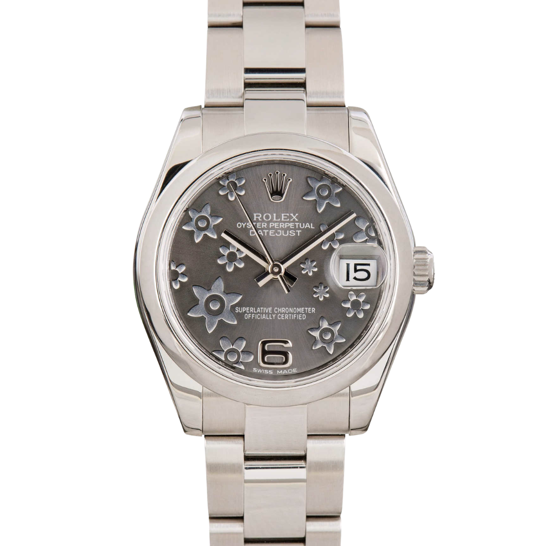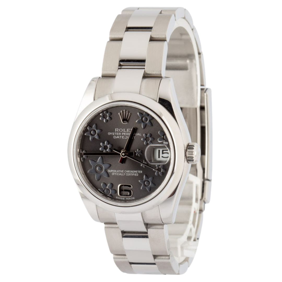 A Rolex Datejust 31 reference 178240 in stainless steel, featuring the distinctive grey floral dial. The embossed floral motif gives this model a more contemporary and expressive character, while the applied silver numerals and baton markers maintain the unmistakable Datejust identity. The smooth steel bezel keeps the overall aesthetic clean and modern.