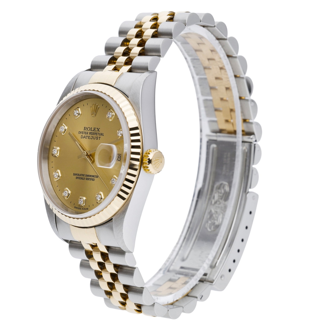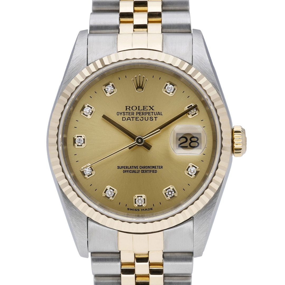A Bi-Metal Rolex Datejust Watch, Stainless Steel and 18ct Yellow Gold with a Yellow Gold Fluted Bezel and Original Diamond Numerals on a Champagne Dial