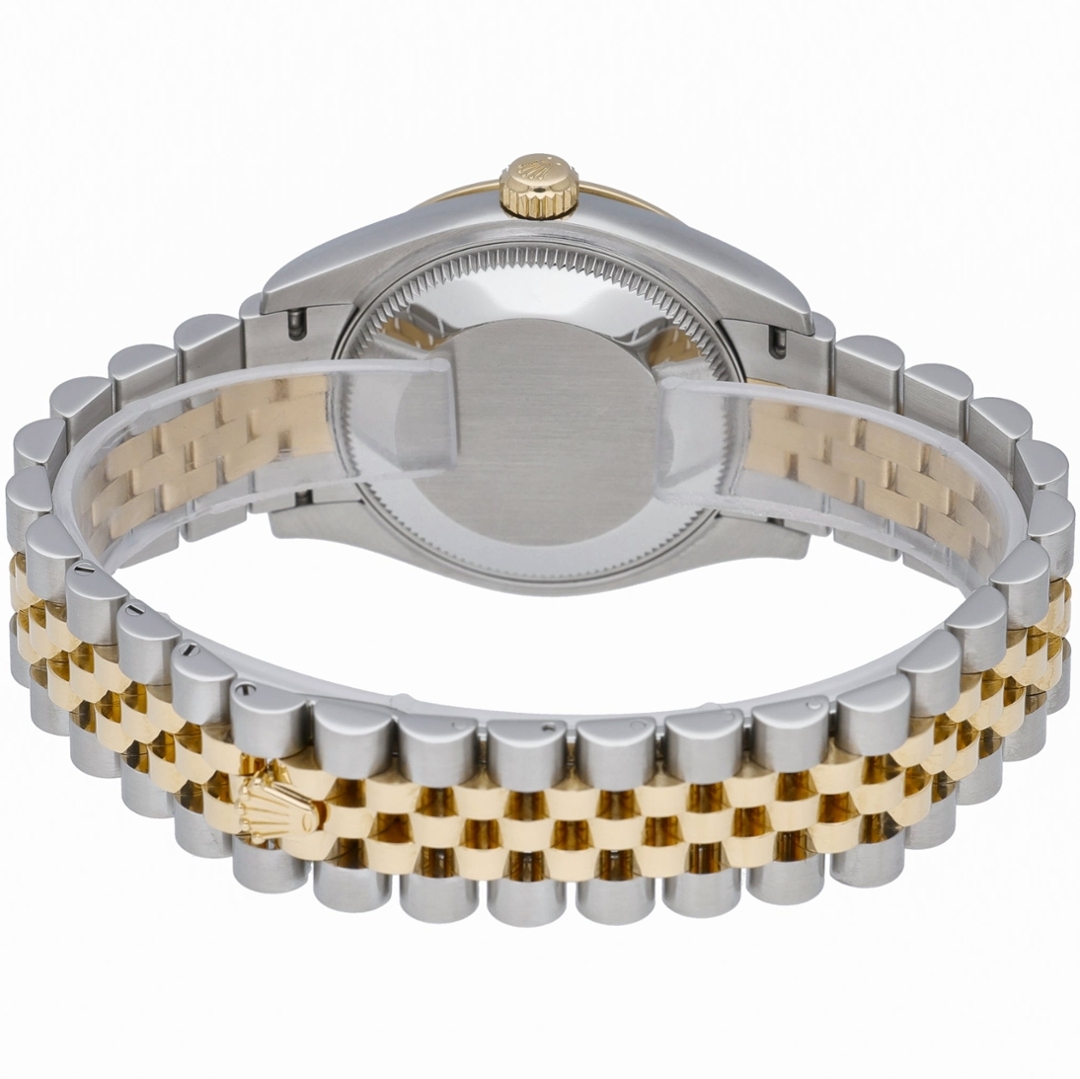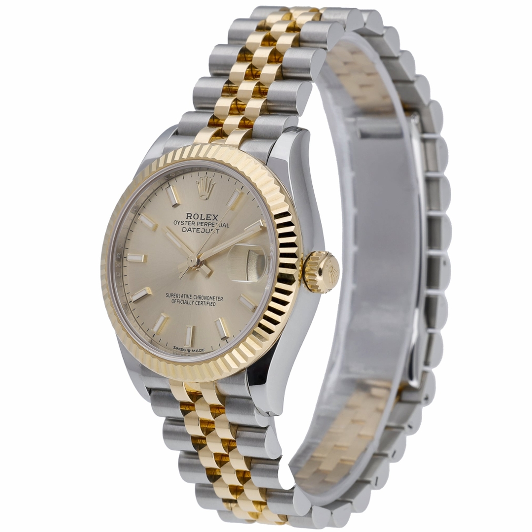 A bi-metal Rolex Datejust reference 278273 features a 31mm stainless steel case paired with an 18ct yellow gold fluted bezel, delivering a classic and instantly recognisable Rolex aesthetic. The champagne dial is clean and well-balanced, fitted with applied baton hour markers and framed by the iconic Cyclops date window at 3 o’clock. The yellow Rolesor bracelet completes the look with a refined yet versatile presence.