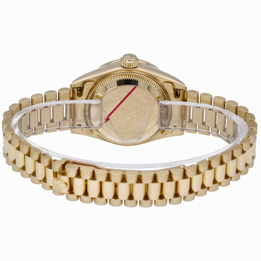 The Rolex Calibre 2135 automatic movement powers the watch, a COSC-certified chronometer renowned for its reliability and accuracy in the 26mm Datejust line. The solid-gold Oyster case, screw-down crown, and robust construction ensure dependable performance suitable for everyday wear, while retaining the refined proportions expected of this reference.