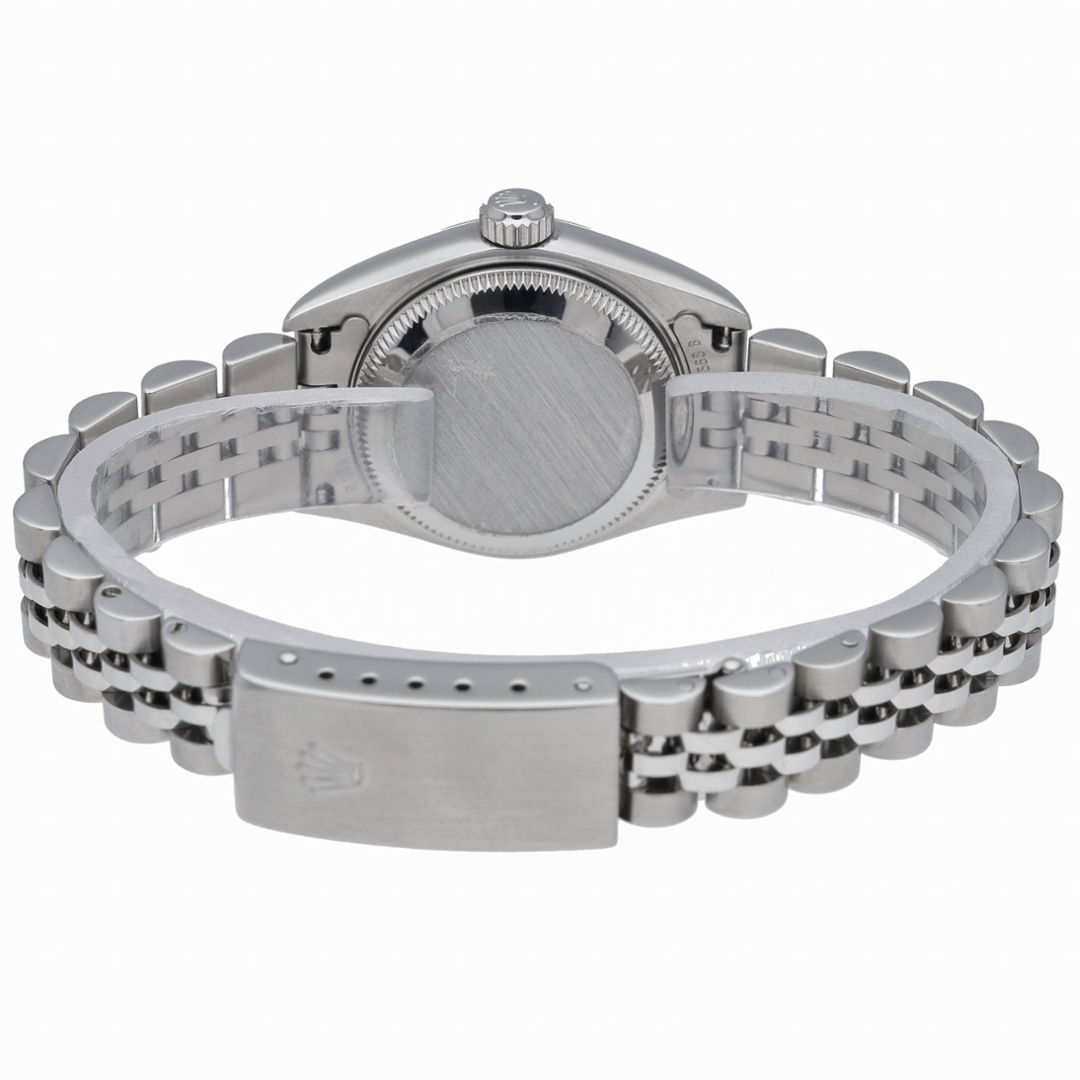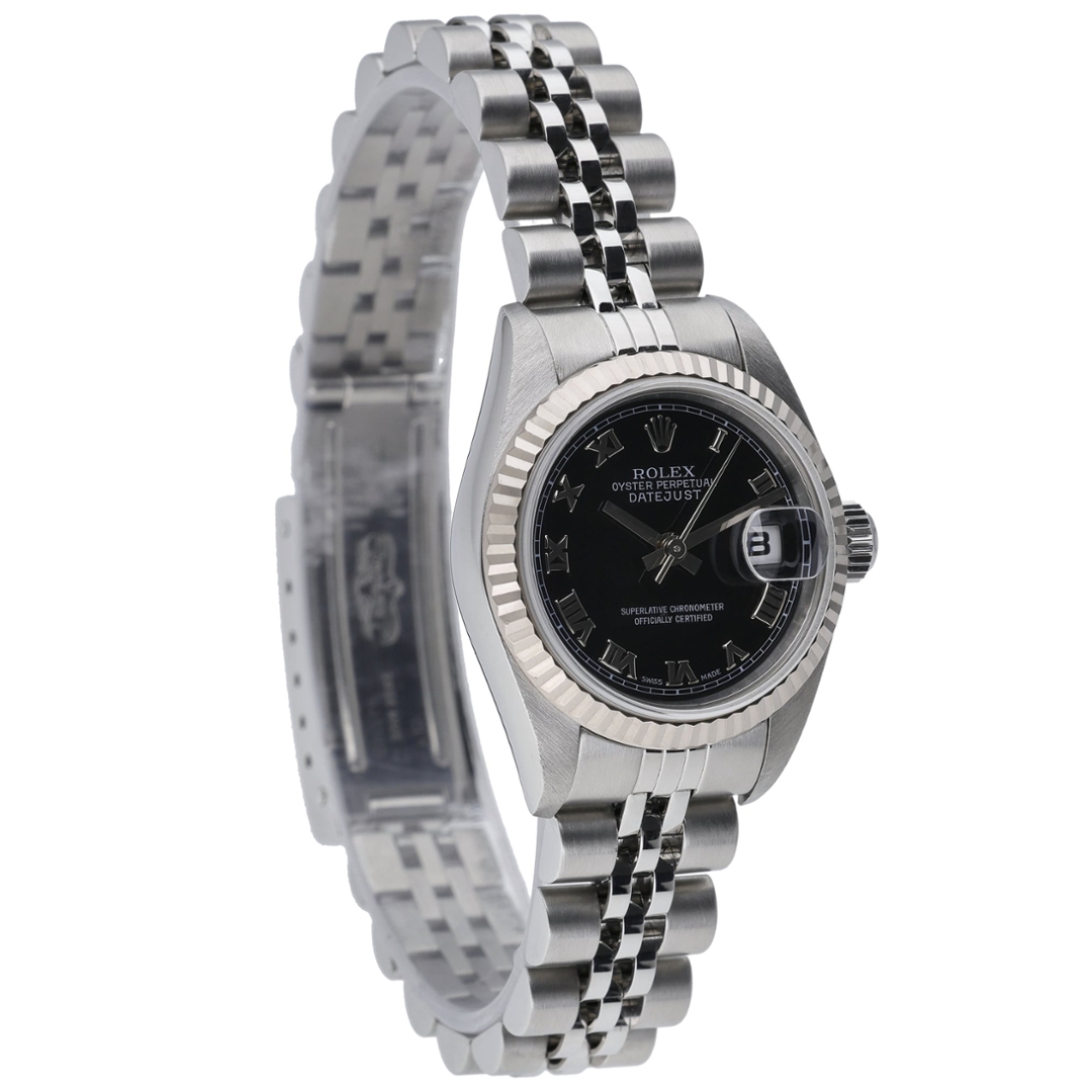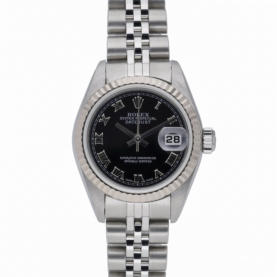 This Rolex Datejust reference 79174 features a classic, understated configuration, crafted in stainless steel with an 18ct white gold fluted bezel. The black dial features applied Roman numerals, offering strong contrast and excellent legibility, while the 26mm case delivers a timeless, well-balanced profile suited to everyday wear.