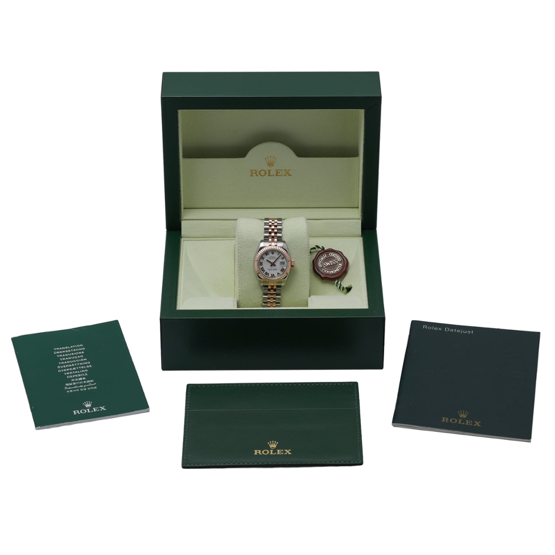 A Rolex Datejust 26 reference 179171 combines classic proportions with the warmth of Rolex’s rose gold aesthetic. Crafted in stainless steel with an 18ct rose gold fluted bezel, the 26mm case delivers a refined and timeless profile.