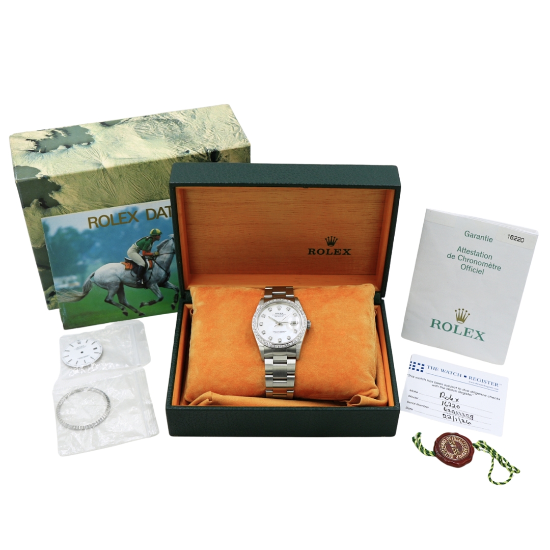 A Rolex Datejust Watch, Stainless Steel with an Afterset Diamond Bezel and White Mother of Pearl Dial with Diamond Numerals (Accompanied by the Original Bezel & Dial)