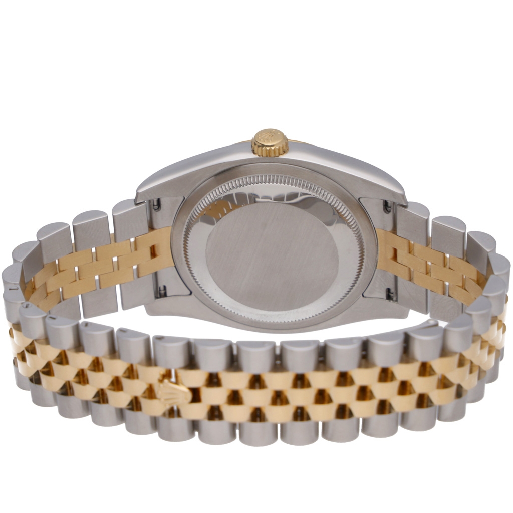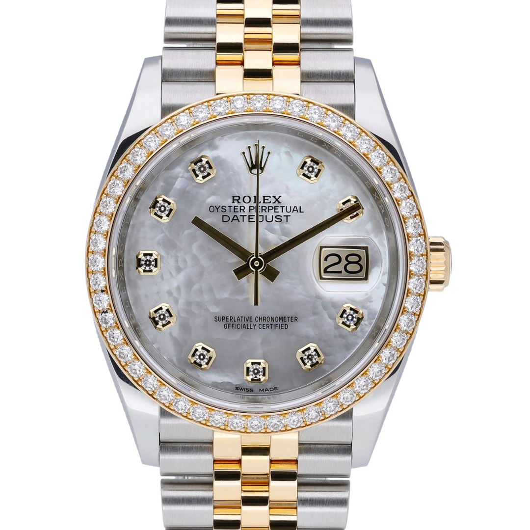 The dial is an original white mother-of-pearl example, set with factory-set diamond hour markers in yellow-gold surrounds. Each mother-of-pearl dial is naturally unique, displaying subtle tonal variations that elevate the watch beyond standard configurations. The Jubilee bracelet completes the traditional Datejust aesthetic, balancing comfort with visual elegance. Powering the watch is the Rolex Calibre 3135 automatic movement, a proven chronometer-certified calibre renowned for durability, precision and long-term reliability.