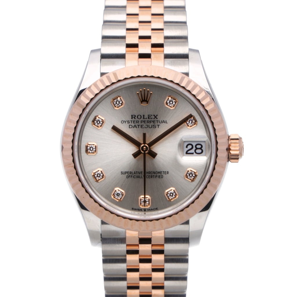 The dial shown features a sunburst finish and is set with original Rolex factory diamond hour markers in Everose surrounds, creating a cohesive, warm aesthetic that pairs seamlessly with the bi-metal construction. The proportions of the 31mm case continue to prove highly popular, offering presence without excess. Powering the watch is the Rolex Calibre 2236 automatic movement, featuring a Syloxi silicon hairspring and Superlative Chronometer certification for precision and reliability.