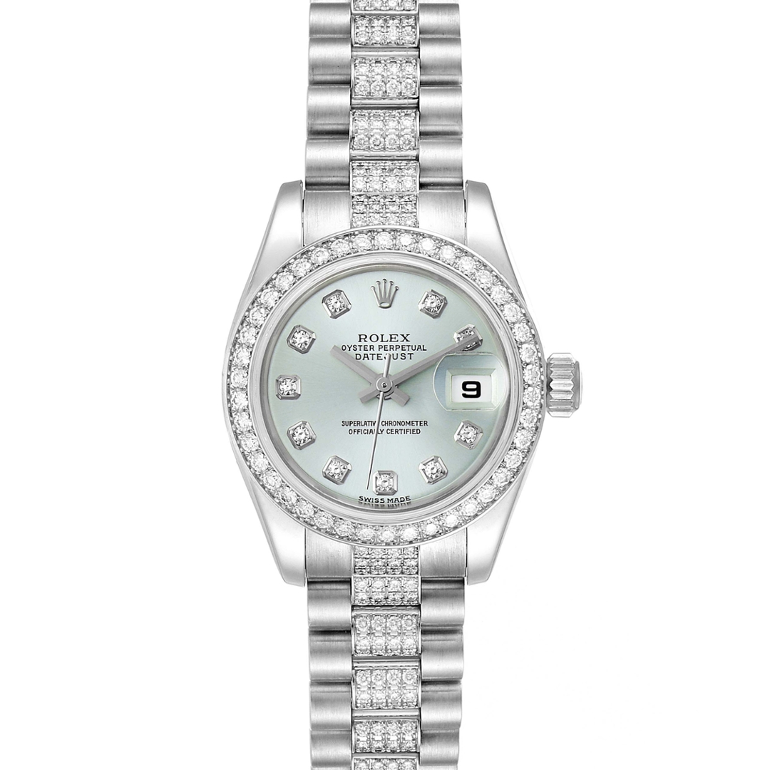 The 26mm case is fitted with a factory diamond-set platinum bezel and mounted on a President bracelet featuring factory diamond-set centre links. The dial is the signature Rolex ice blue, reserved exclusively for platinum models, and set with original factory diamond hour markers. The monochromatic aesthetic, combined with the density of platinum, gives the watch a presence that far exceeds its compact proportions. Powering the piece is the Rolex Calibre 2235 automatic movement, a chronometer-certified calibre renowned for reliability and long-term performance.