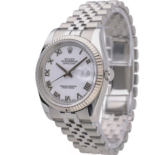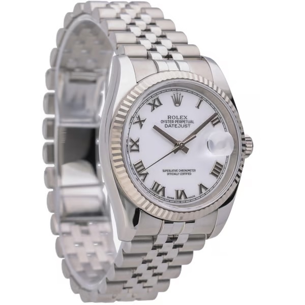 A Rolex Datejust reference 116234 in stainless steel with an 18ct white gold fluted bezel and crisp white dial. The 36mm Oyster case delivers classic proportions, paired with the signature fluted bezel that catches the light with unmistakable Rolex presence. Black Roman numerals contrast sharply against the white dial, while the Jubilee bracelet enhances comfort and refinement, making this configuration a timeless everyday choice.