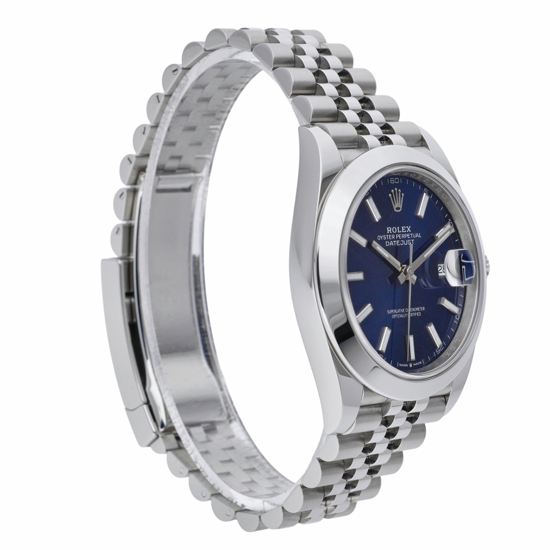 A Rolex Datejust 41, reference 126300, crafted in stainless steel and presented with a striking blue dial. The 41mm Oyster case delivers balanced wrist presence, while the smooth bezel maintains a clean, contemporary profile. The vibrant sunburst blue dial features luminous baton hour markers and a classic date display at 3 o’clock beneath the Cyclops lens, offering sharp legibility and timeless appeal.