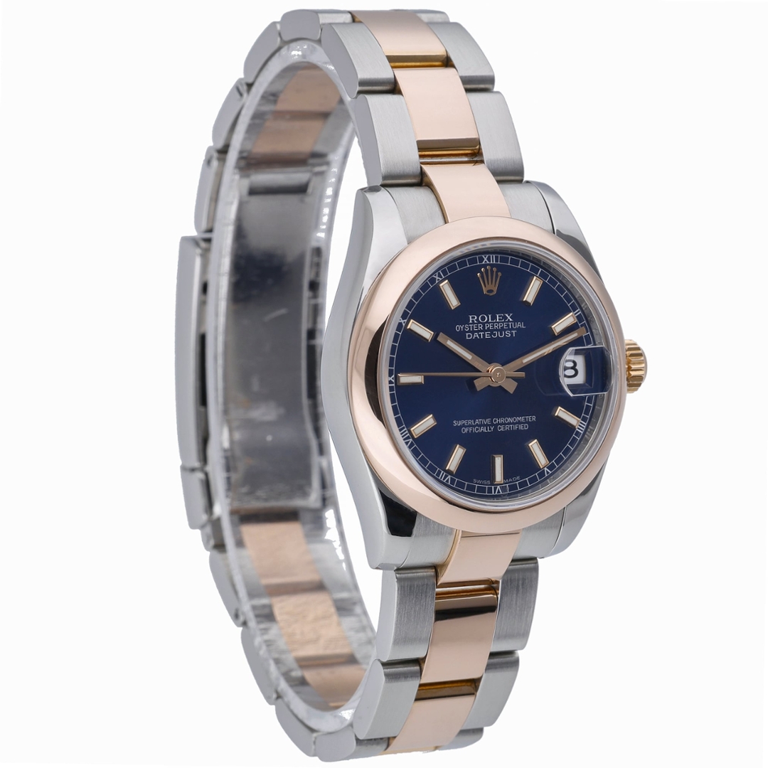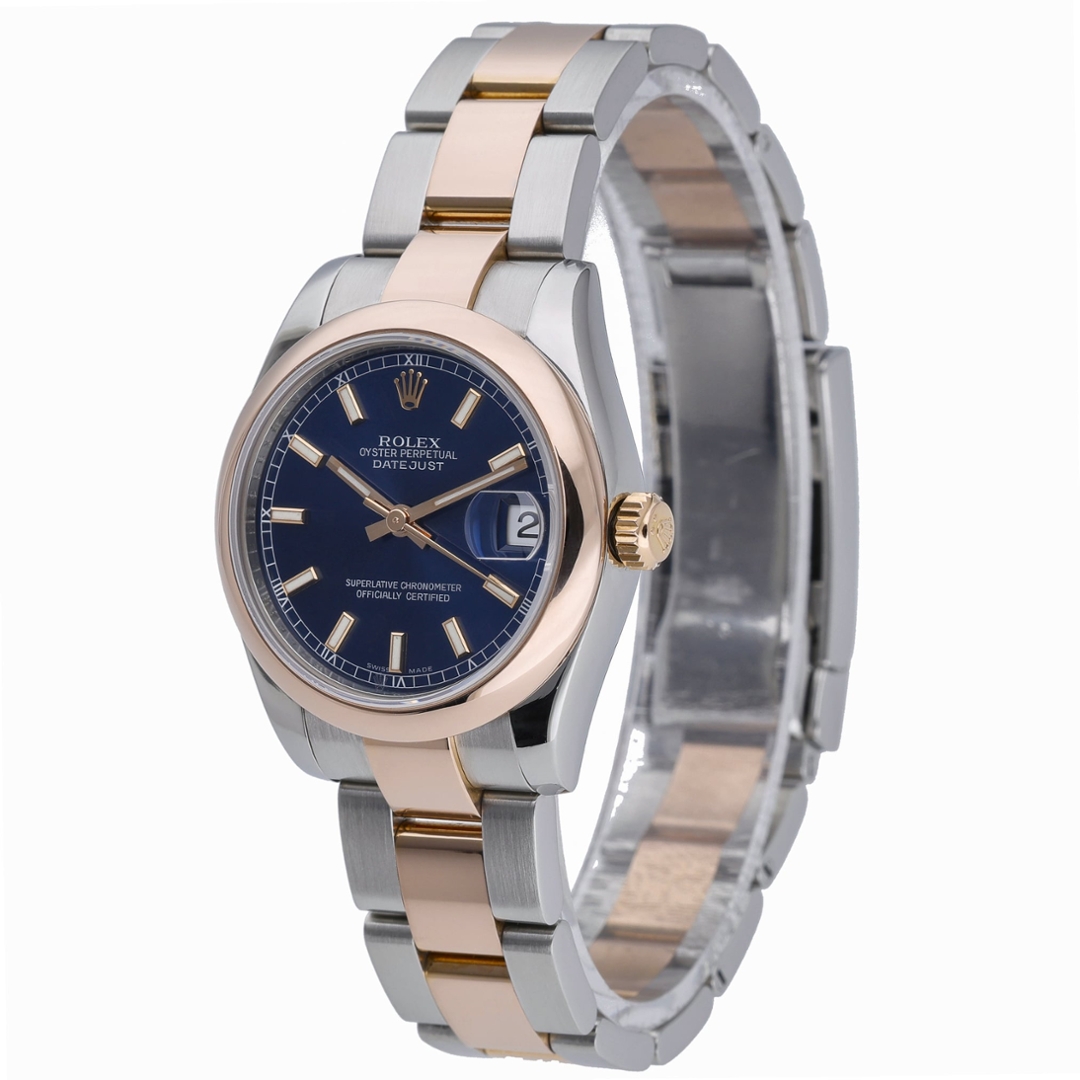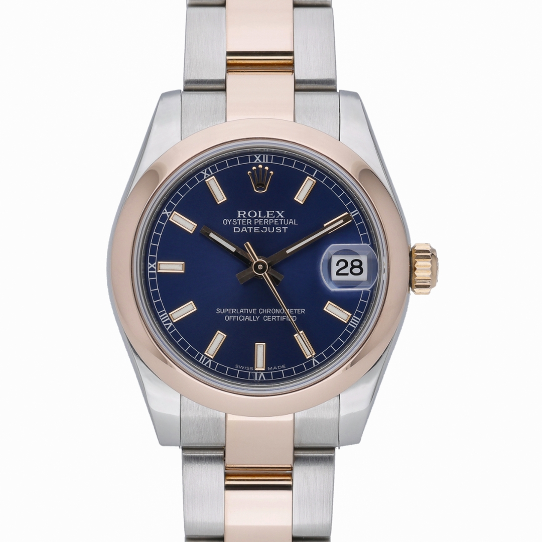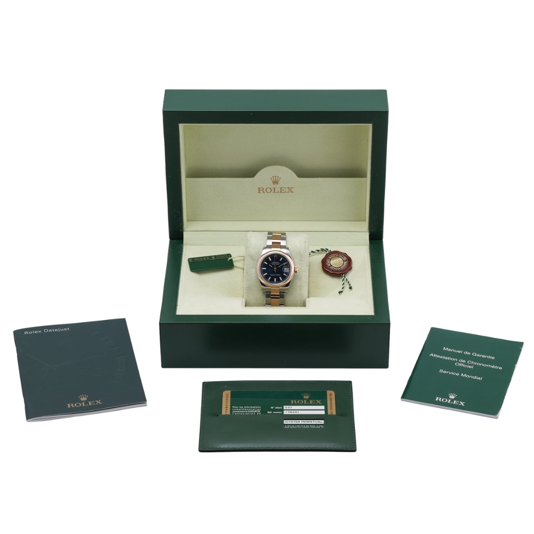 A Rolex Datejust 178241 crafted in stainless steel and 18ct Everose gold, featuring a smooth rose gold bezel and a rich blue dial. The 31mm Oyster case offers refined, elegant proportions, making it a versatile choice for both everyday wear and more formal occasions. The deep blue dial is enhanced by luminous baton hour markers and rose gold hands, while the date display at 3 o’clock beneath the Cyclops lens ensures clear, practical legibility.