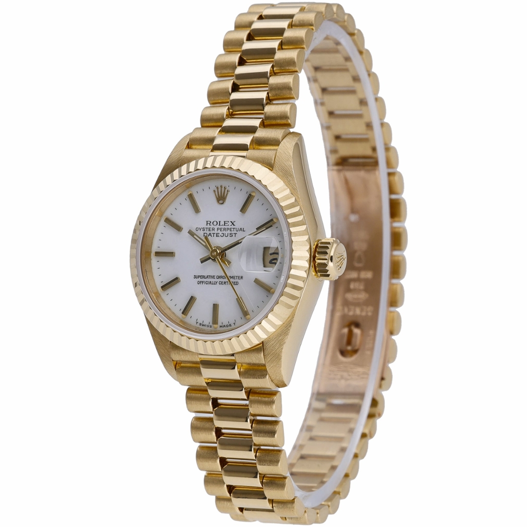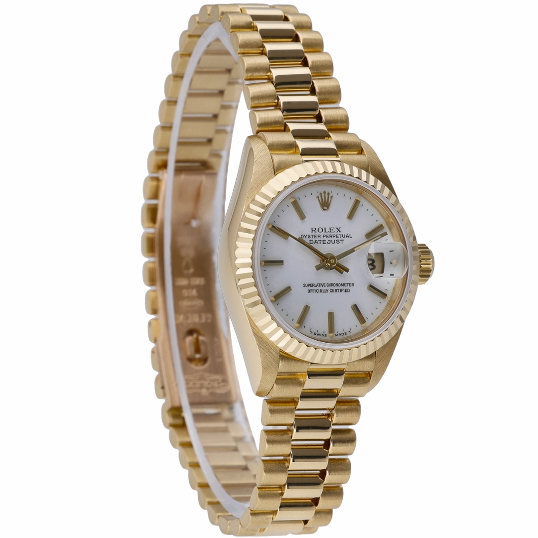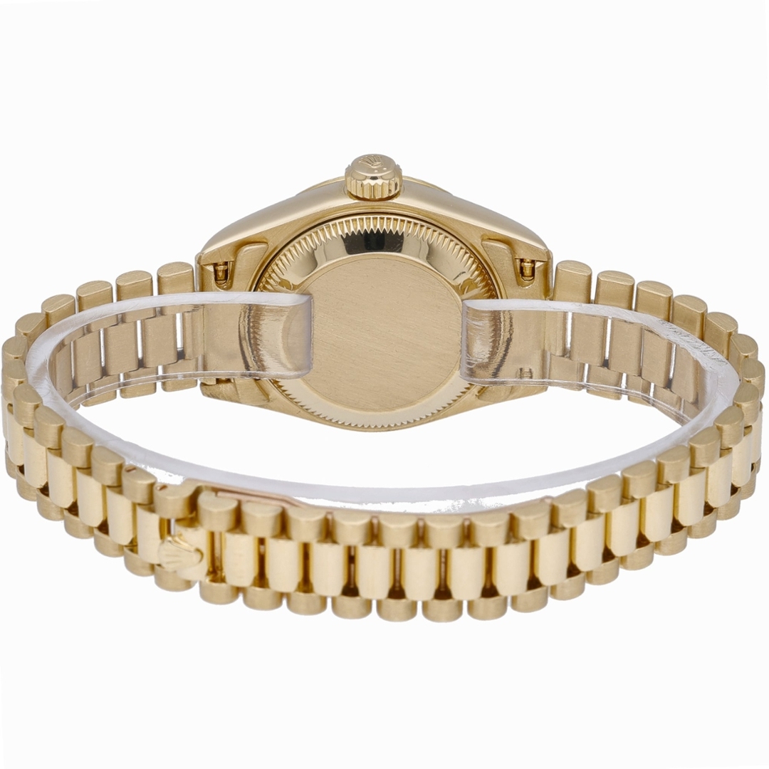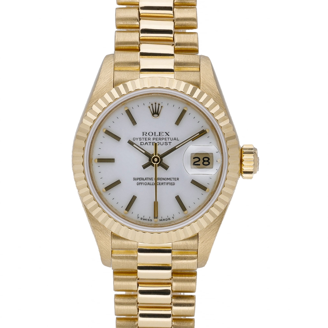 At the heart of the watch is the Rolex Calibre 2135 automatic movement, a reliable in-house movement developed specifically for Rolex’s smaller Datejust models. Known for its durability and precision, the movement features a quick-set date function displayed beneath the iconic Cyclops magnification at 3 o’clock. The solid 18ct yellow gold President bracelet further enhances the watch’s classic aesthetic, providing both comfort and unmistakable prestige on the wrist.
