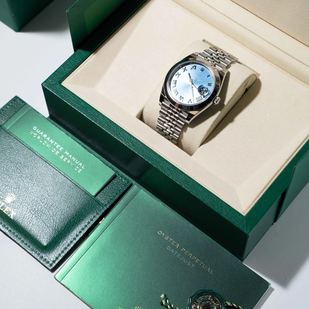 Presented in immaculate condition, this example is supplied with its original full set of paperwork, box, and certification, and is covered by the Rolex manufacturer's warranty until 2031. A modern and highly desirable configuration, combining the versatility of stainless steel with the elevated character of the Roman numeral blue dial.