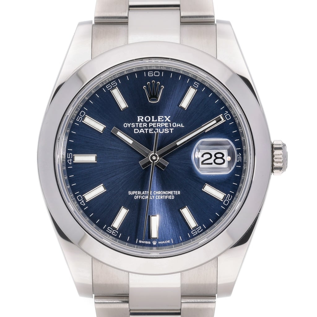 A Rolex Datejust 41 reference 126300 in stainless steel, featuring a 41mm Oyster case with a smooth bezel and a refined, contemporary profile. The blue sunburst dial offers a rich, shifting tone under light, complemented by applied baton hour markers and polished hands with Chromalight display. The classic Datejust layout is enhanced by the Cyclops lens over the date, maintaining strong legibility and timeless appeal.