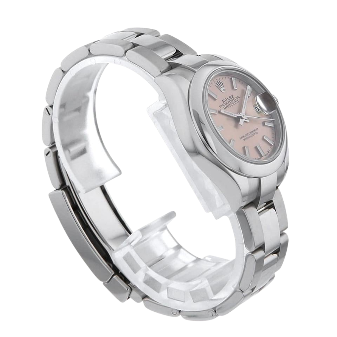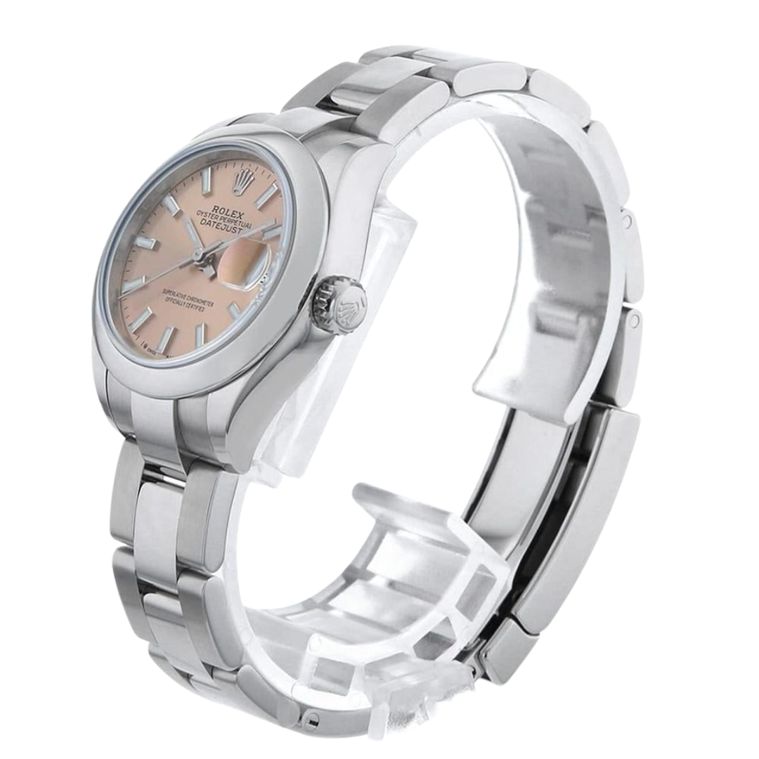 A Rolex Datejust 28 reference 279160 in stainless steel, featuring a smooth bezel and a refined Oyster bracelet, offering a clean, contemporary interpretation of this enduring classic. The soft pink dial adds a subtle yet distinctive touch, complemented by applied baton hour markers and luminous hands, delivering both elegance and everyday versatility in a compact 28mm case.