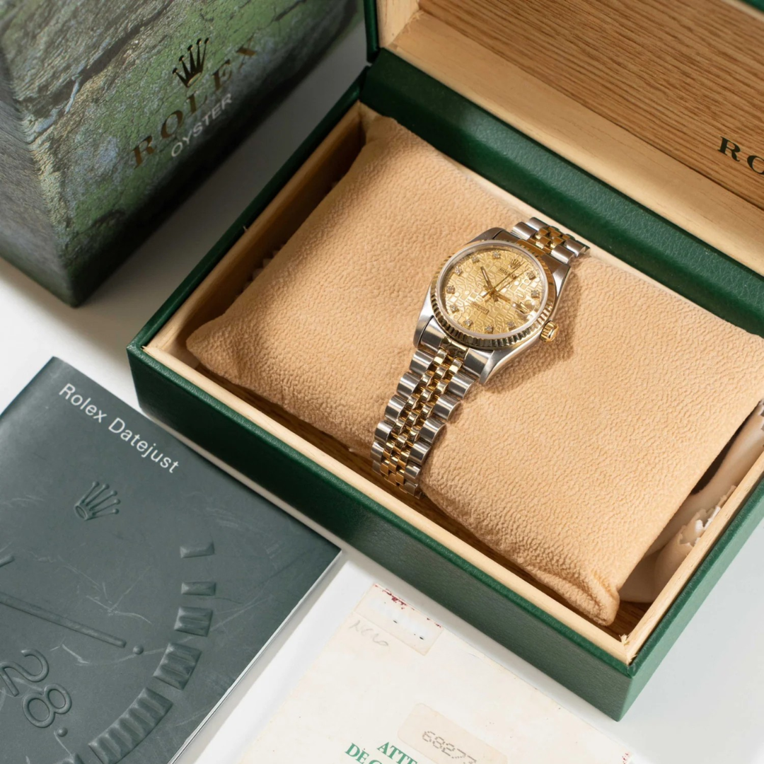 A Rolex Datejust reference 68273 in stainless steel and 18ct yellow gold, presented in a classic 31mm Oyster case with an 18ct yellow gold fluted bezel. The champagne Jubilee dial is a standout feature, showcasing the iconic repeating Rolex motif across its surface, further enhanced by original diamond-set hour markers that add both depth and refined brilliance to this distinctive configuration.