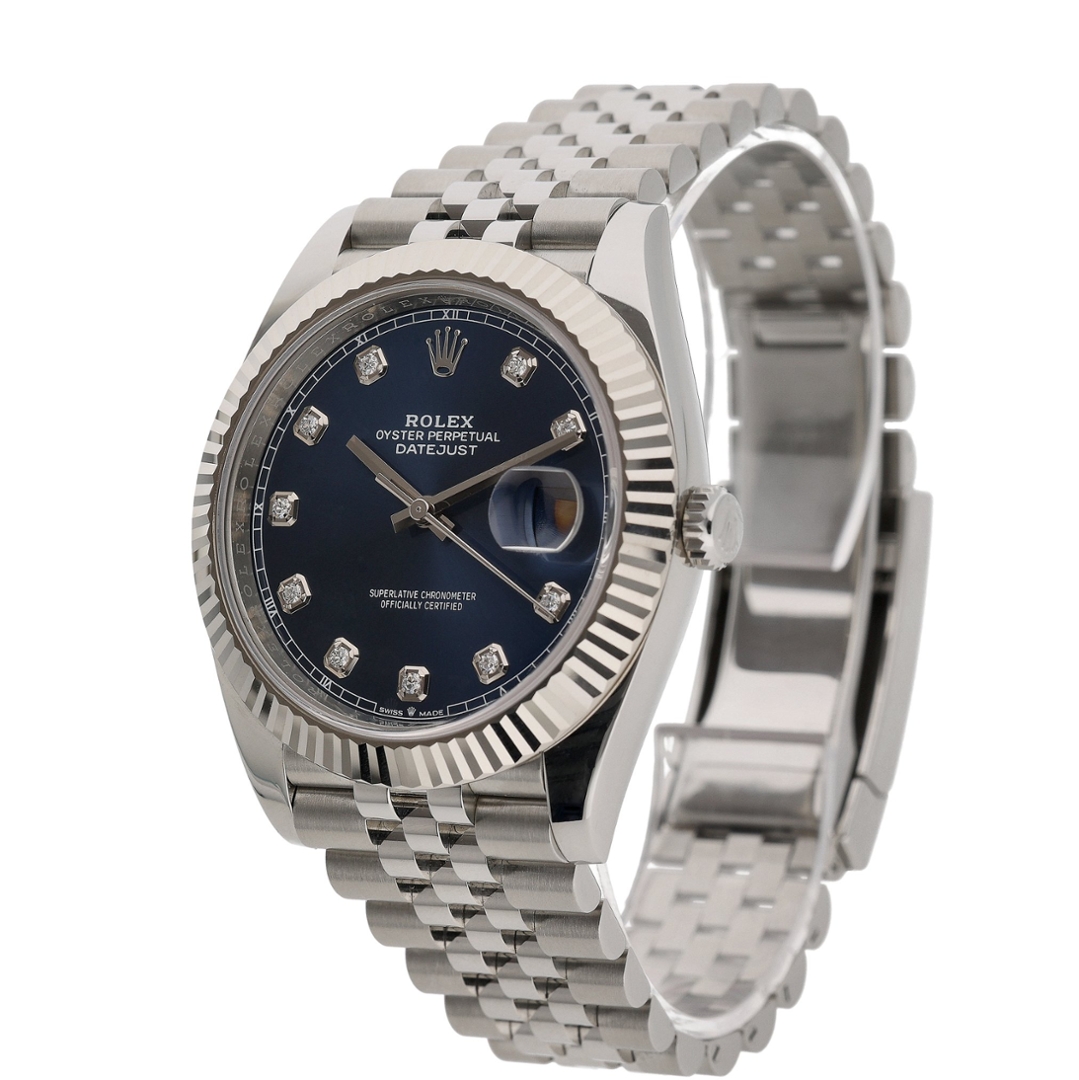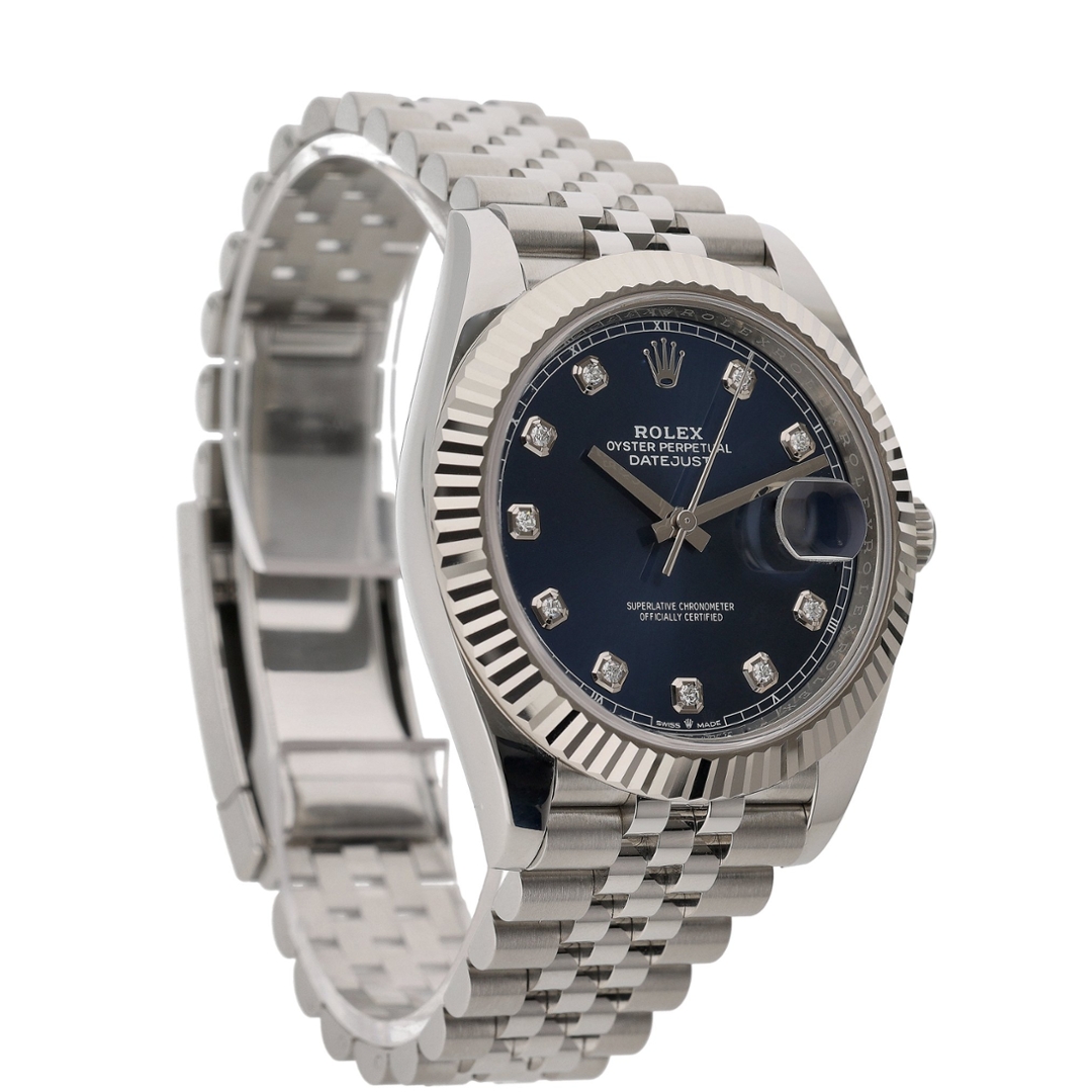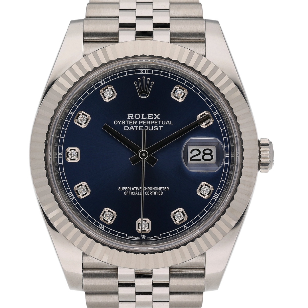 A Rolex Datejust 126334 is a refined expression of luxury and precision, seamlessly blending iconic design with modern innovation. This 2025 model, crafted from stainless steel and 18ct white gold, features the signature fluted bezel in solid white gold, adding a distinguished touch of elegance. The deep blue dial, adorned with original Rolex diamond numeral hour markers, enhances its luxurious appeal while ensuring exceptional legibility. With its 41mm case size, this timepiece offers a bold yet sophisticated presence, making it an ideal choice for any occasion.