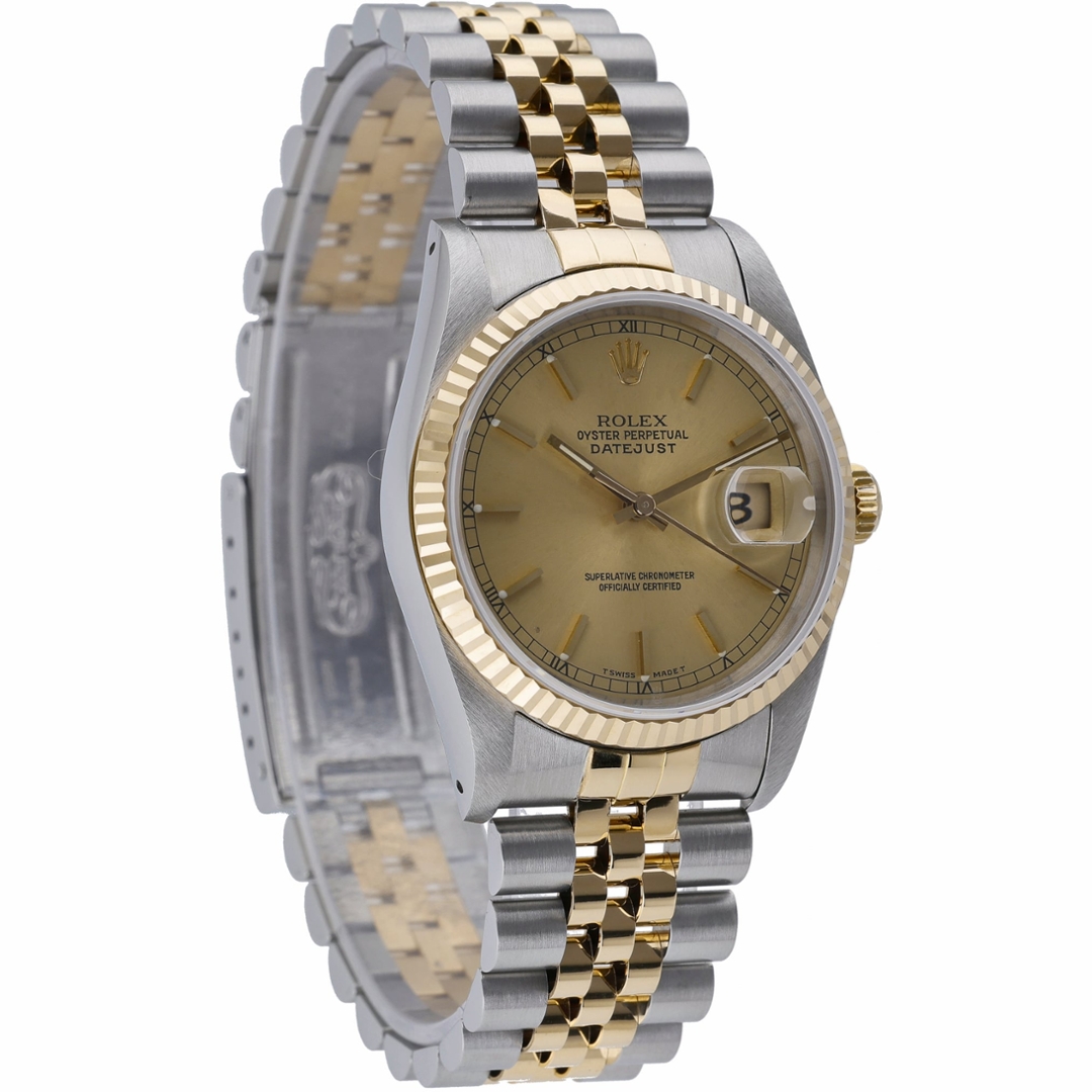 A Rolex Datejust 16233 in its most recognisable and enduring configuration, combining stainless steel and 18ct yellow gold with the signature fluted bezel and classic champagne dial. The 36mm case delivers a balanced and versatile wrist presence, while the warm tones of the dial and gold accents create a refined, unmistakably Rolex aesthetic that has remained in demand for decades.