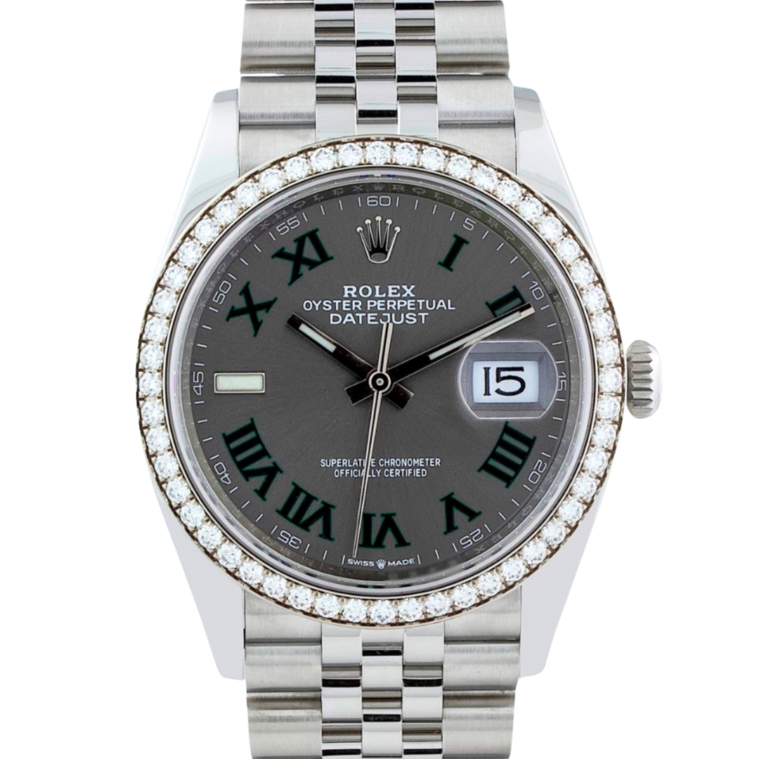 A Rolex Datejust 36, this reference 126284RBR pairs refined craftsmanship with a striking, contemporary aesthetic. The 36mm stainless-steel case is complemented by an 18ct white-gold diamond-set bezel, offering a sophisticated sparkle that elevates the watch without compromising its versatility. The slate dial is one of the standout configurations in the modern Datejust line, featuring rich tones and contrasting green Roman numerals that give the watch a distinctive and highly desirable look. Paired with the Jubilee bracelet, it delivers exceptional comfort and unmistakable Rolex elegance.