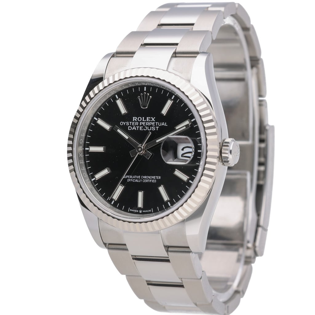 A Rolex Datejust 36 reference 126234 in stainless steel, featuring a sleek black dial with applied baton hour markers and the signature Cyclops date display. The 18ct white gold fluted bezel adds contrast and refinement, elevating the otherwise understated monochrome aesthetic, while the Oyster bracelet gives the watch a more contemporary and robust feel on the wrist.