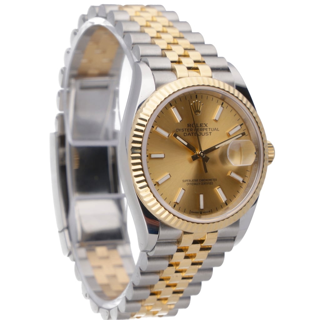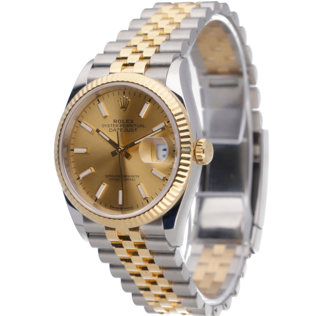 A Rolex Datejust 36 reference 126233 in stainless steel and 18ct yellow gold, featuring a classic champagne sunburst dial with applied baton hour markers and the signature Cyclops date display. The yellow gold fluted bezel adds depth and refinement, pairing seamlessly with the warm dial tones, while the Jubilee bracelet enhances overall elegance and comfort on the wrist.