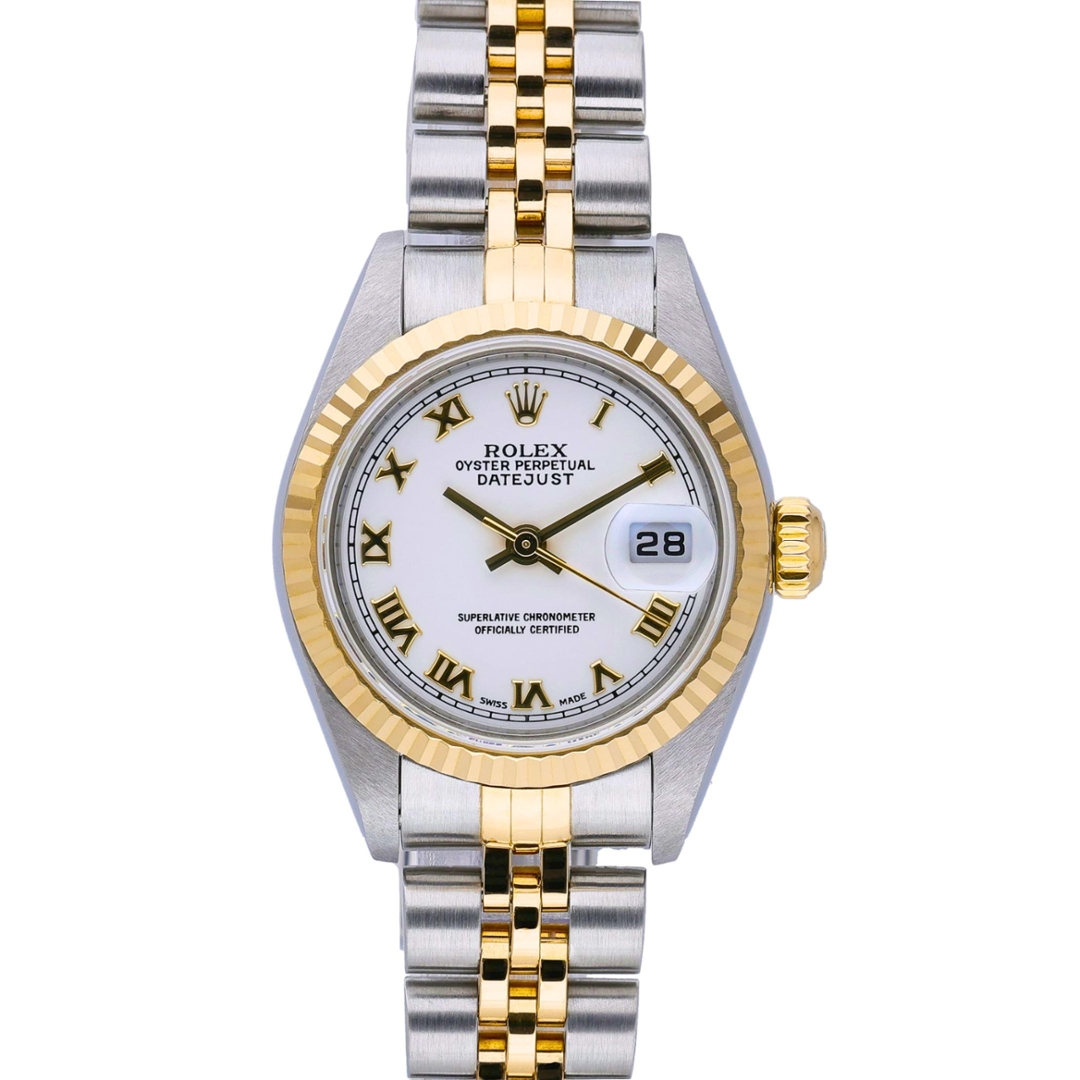 A Bi-Metal Rolex Datejust combining stainless steel and 18ct yellow gold, presented in the classic 26mm case with the iconic Jubilee bracelet. The yellow gold fluted bezel adds a signature Rolex detail, framing a clean white dial set with applied Roman numeral hour markers in gold tones, delivering a timeless and elegant aesthetic that remains highly sought after.